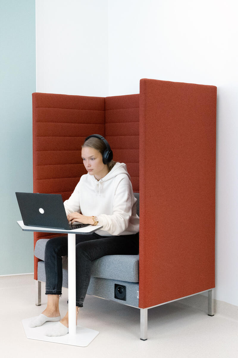 Datorbord för lärmiljöer. Flera bord kan ställas tillsammans i olika kombinationer. Mått: L64xB43xH65 cm. Radie på bordsskiva: 40 mm. Spånskiva belagd med högtryckslaminat. Svart stålstativ.