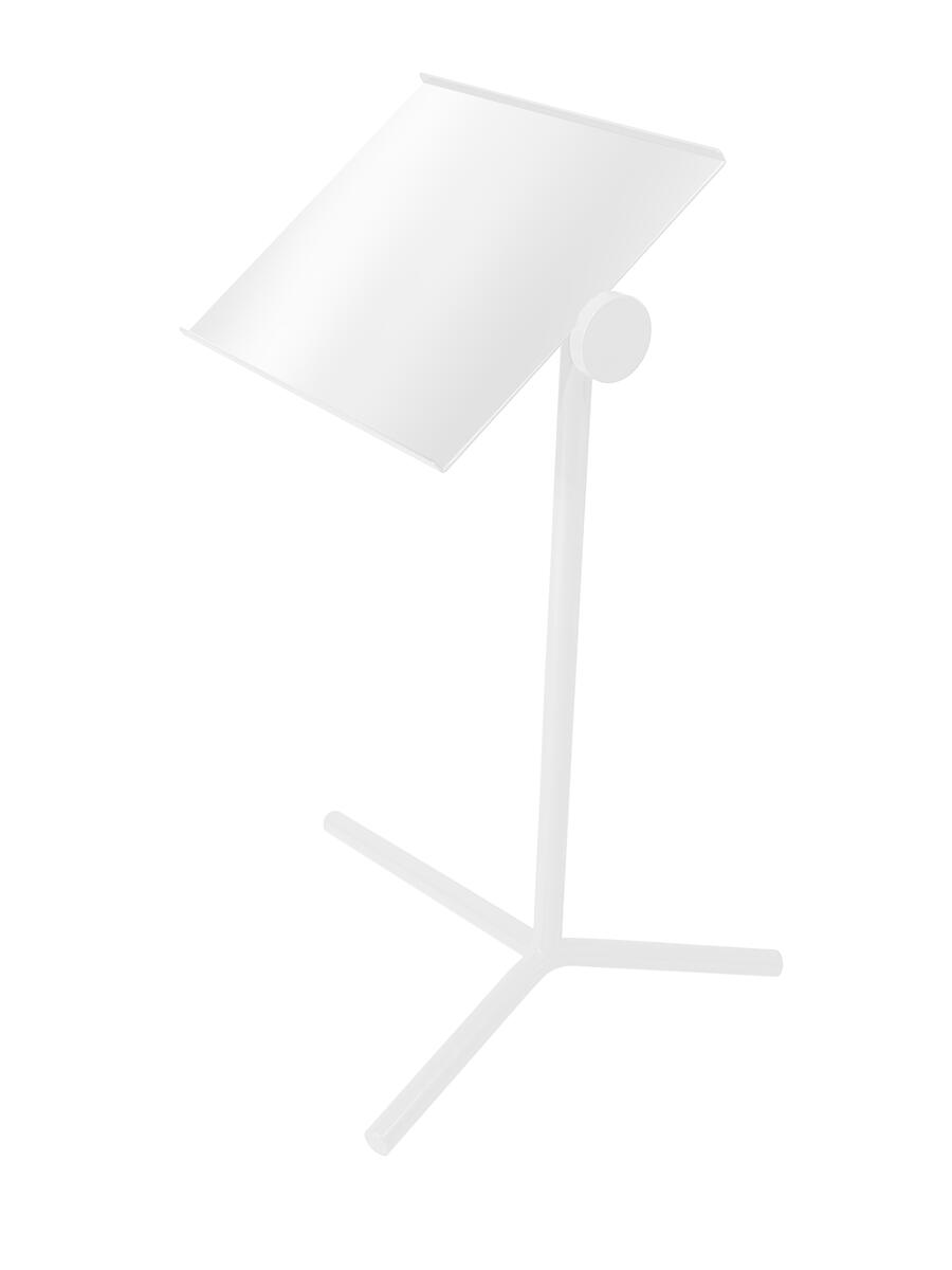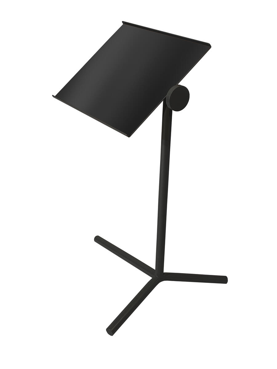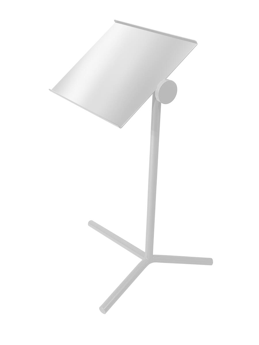 Skiva i akustiklaminat. Rundade hörn på skivan, 5 cm radie. Björkmönstrad ABS-kantlist. 4 cm hög sarg. Silverlackerat stålstativ med avtagbara runda ben i ø 4 cm. Ställbara tassar och förstärkt gods i infästningen.