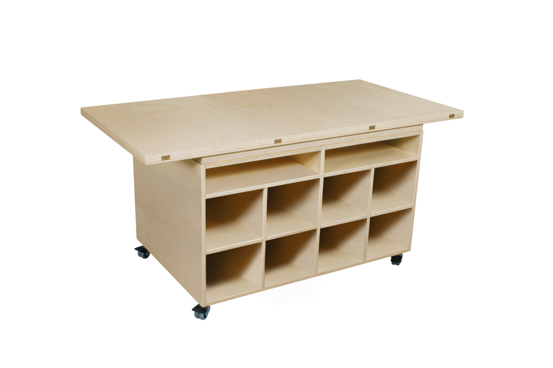 Bord i klarlackad björkkryssfaner med hjul. Under bordet finns plats för 16 förvaringslådor. Passar bra t.ex. i ett makerspace. Hopfällt är bordet 160x80 cm och utfällt 160x160 cm. Höjd 72 cm.