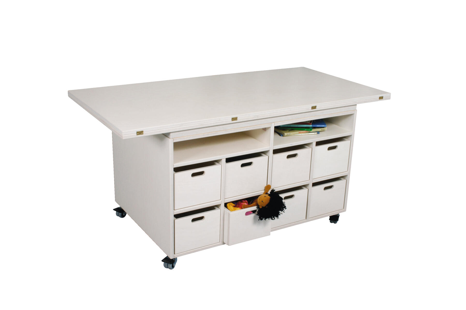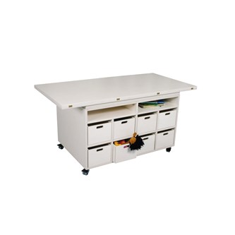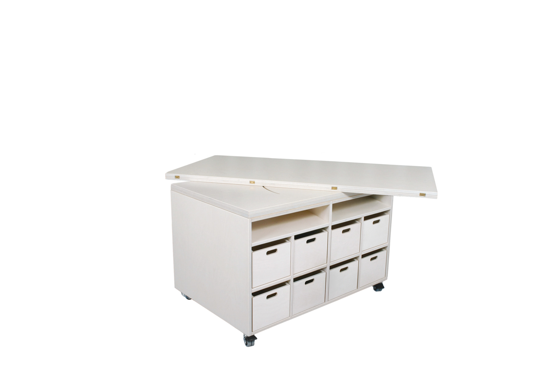 Tillverkat i vitpigmenterad björkkryssfaner. Under bordet finns plats för 16 st. förvaringslådor. Passar bra t.ex. i ett makerspace. Hopfällt är bordet 160x80 cm och utfällt 160x160 cm. Höjd 72 cm. Med hjul.