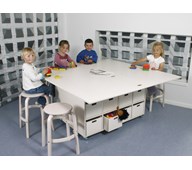 Praktiskt lekbord med rund toppskiva i laminat och 8 förvaringslådor. Tillverkat i vitpigmenterad björkkryssfanér. Mått: Bas B80xD80xH50 cm inkl. hjul. Toppskiva ø 117 cm.