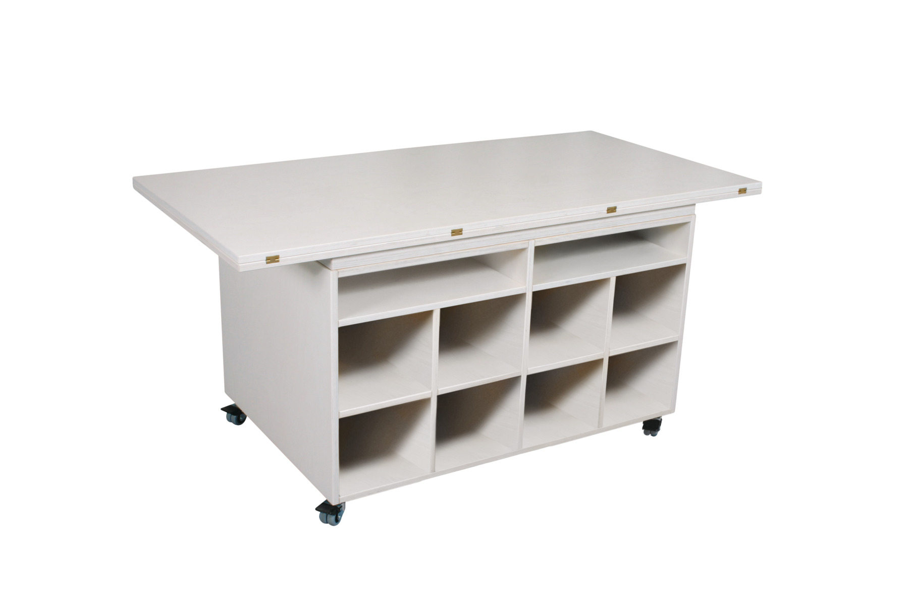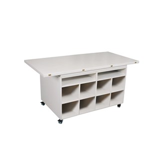Tillverkat i vitpigmenterad björkkryssfaner. Under bordet finns plats för 16 st. förvaringslådor. Passar bra t.ex. i ett makerspace. Hopfällt är bordet 160x80 cm och utfällt 160x160 cm. Höjd 72 cm. Med hjul.