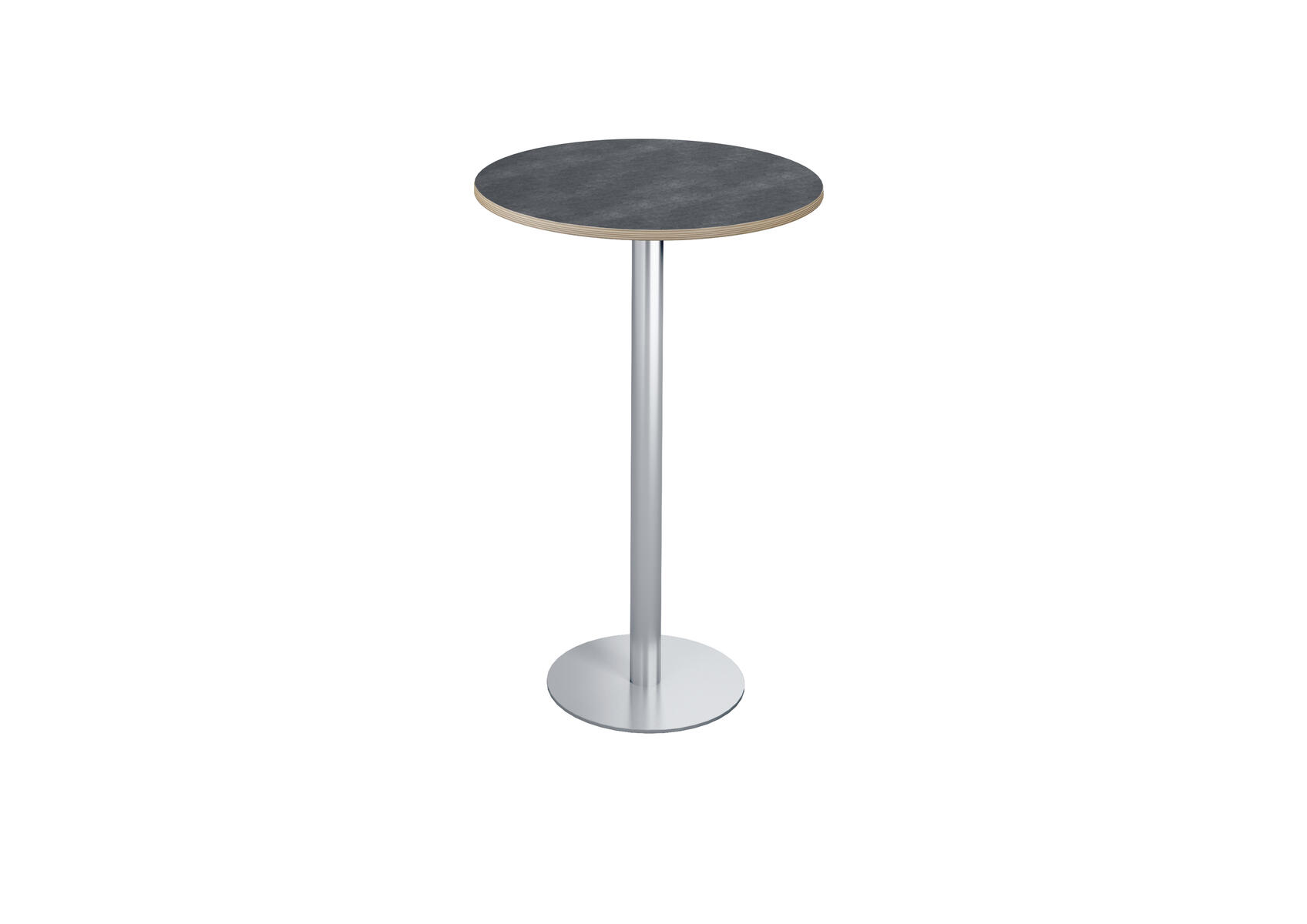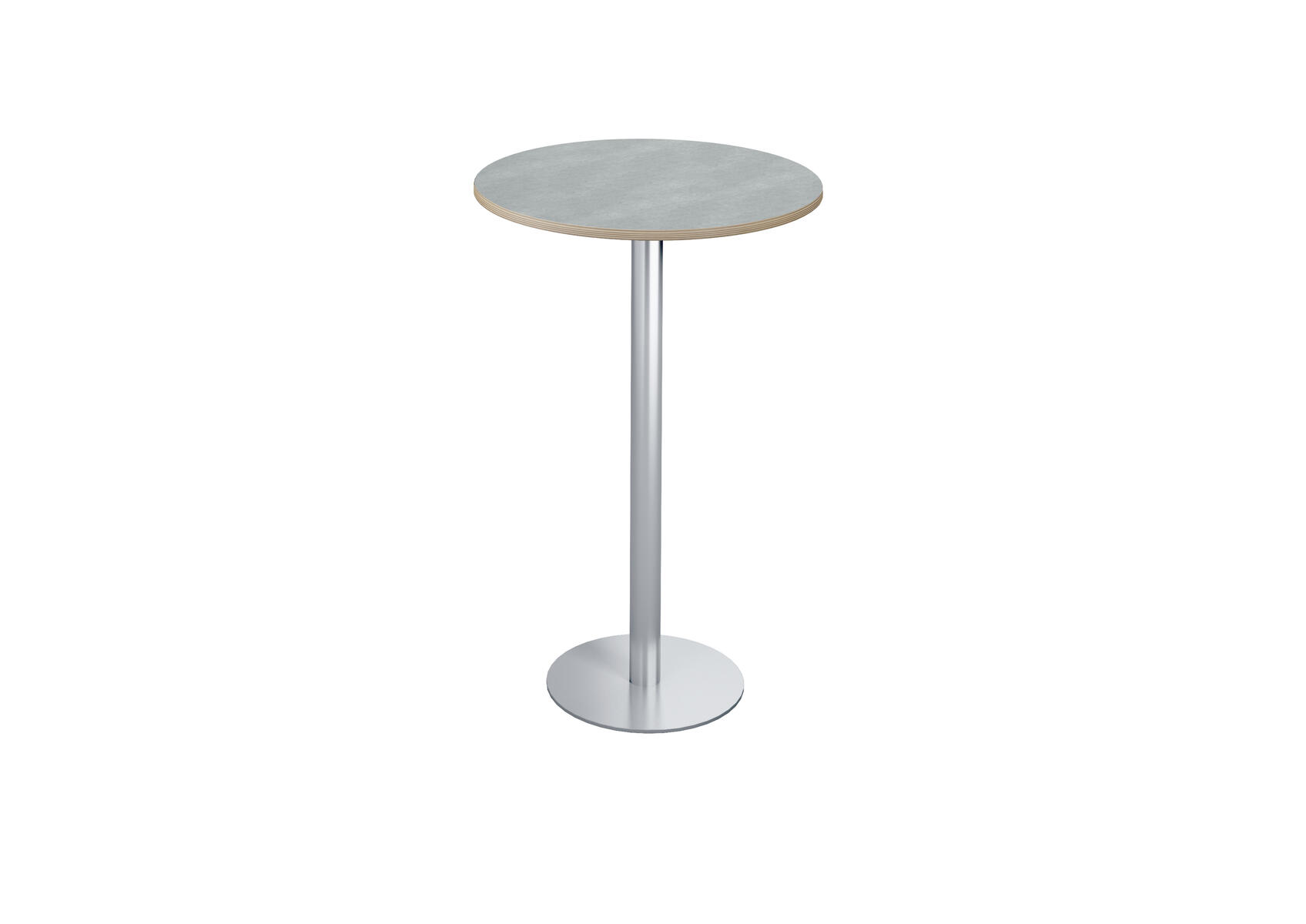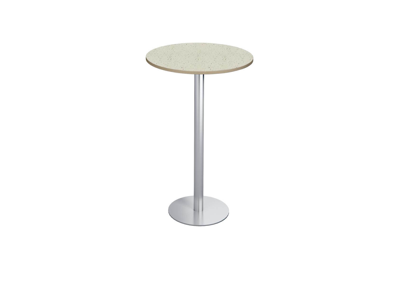 Pelarbord med lackat stativ i RAL 9006. Bordsskiva med ljuddämpande yta i tåligt linoleum. Testat och godkänt enligt EN 15372:2016 som uppfyller krav för stabiltet, hållbarhet och säkerhet.