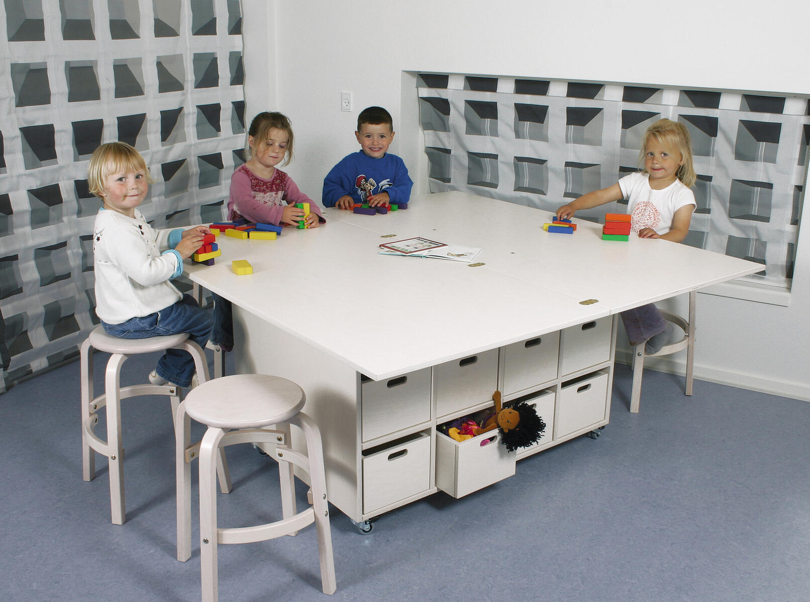 Under bordet finns plats för 16 förvaringslådor. Med hjul. Passar bra t.ex. i ett makerspace. Hopfällt är bordet 160x80 cm och utfällt 160x160 cm. Höjd 72 cm. Tillverkat i vitpigmenterad björkkryssfaner.