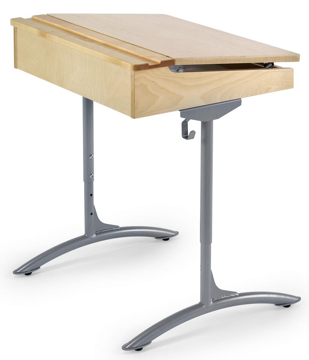 Locket kan vinklas 6 grader. Ställskruvar på främre benparet. Dubbla väskkrokar. Mått: B65xD55 cm. Mått på bänklock: B65xD42 cm. Ställbar i höjderna 64, 70, 76, 82 och 88 cm. Lådstomme och pennränna i björk. Bänklock i massiv björk. Stativ i silver, RAL 9006.