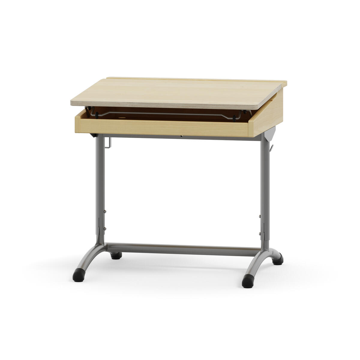 Locket kan vinklas 6 grader. Ställskruvar på främre benparet. Dubbla väskkrokar. Mått: B65xD55 cm. Mått på bänklock: B65xD42 cm. Ställbar i höjderna 64, 70, 76, 82 och 88 cm. Lådstomme och pennränna i björk. Bänklock i massiv björk. Stativ i silver, RAL 9006.