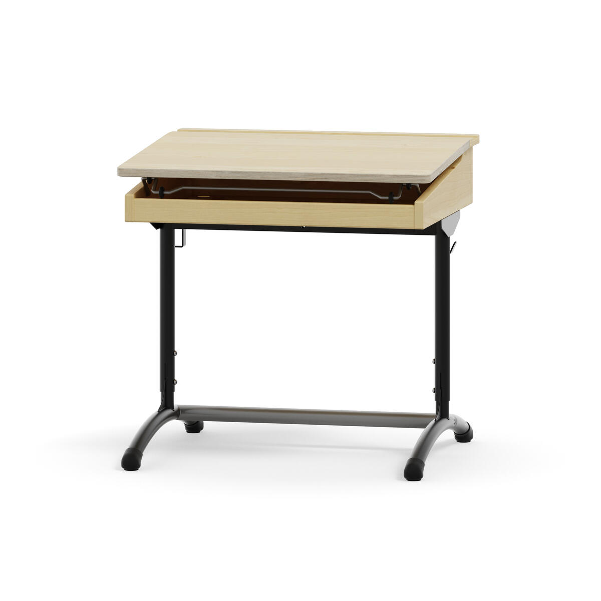 Locket kan vinklas 6 grader. Ställskruvar på främre benparet. Dubbla väskkrokar. Mått: B65xD55 cm. Mått på bänklock: B65xD42 cm. Ställbar i höjderna 64, 70, 76, 82 och 88 cm. Lådstomme och pennränna i björk. Bänklock i massiv björk. Stativ i silver, RAL 9006.