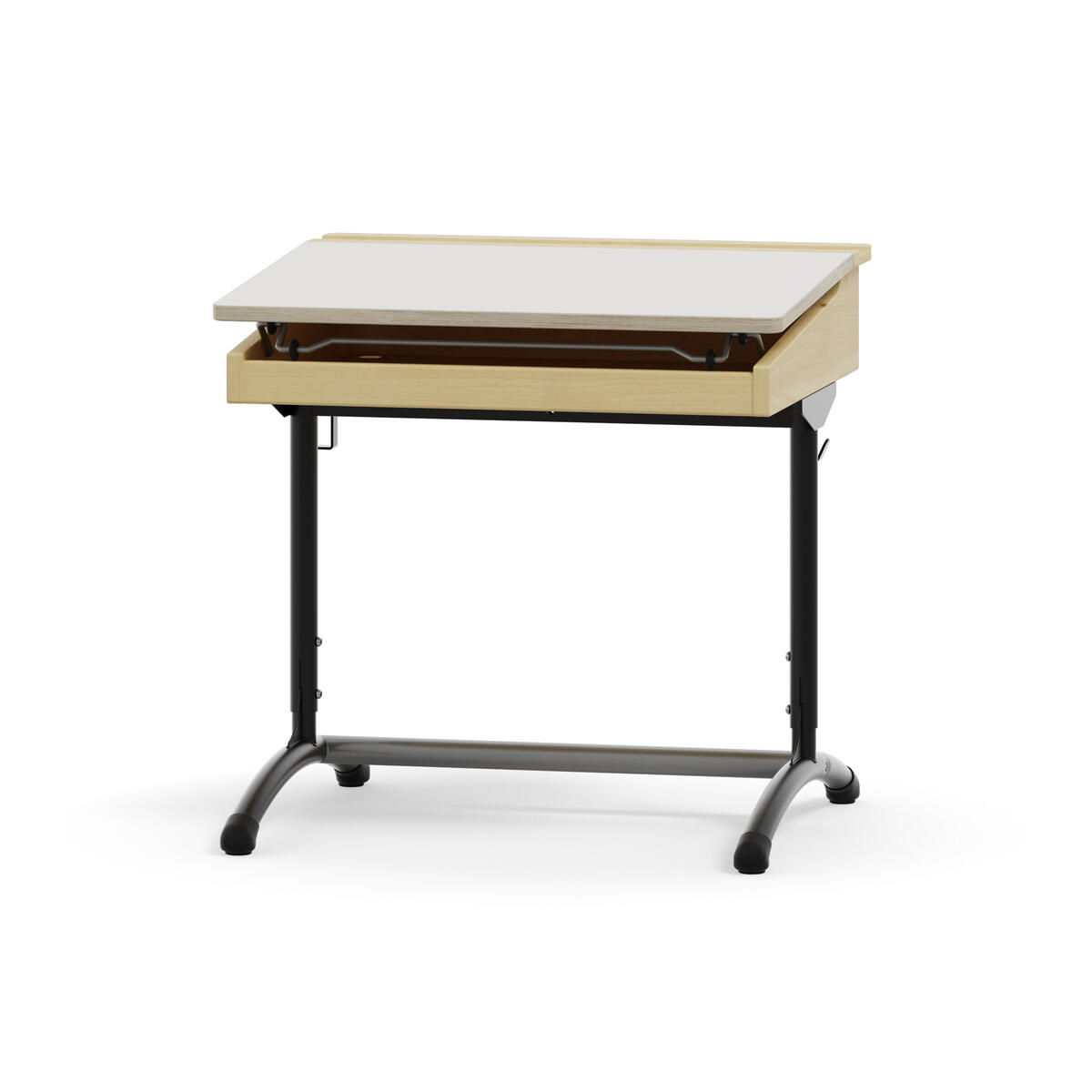 Locket kan vinklas 6 grader. Ställskruvar på främre benparet. Dubbla väskkrokar. Mått: B65xD55 cm. Mått på bänklock: B65xD42 cm. Ställbar i höjderna 64, 70, 76, 82 och 88 cm. Lådstomme och pennränna i björk. Bänklock i akustiklaminat. Stativ i silver, RAL 9006.