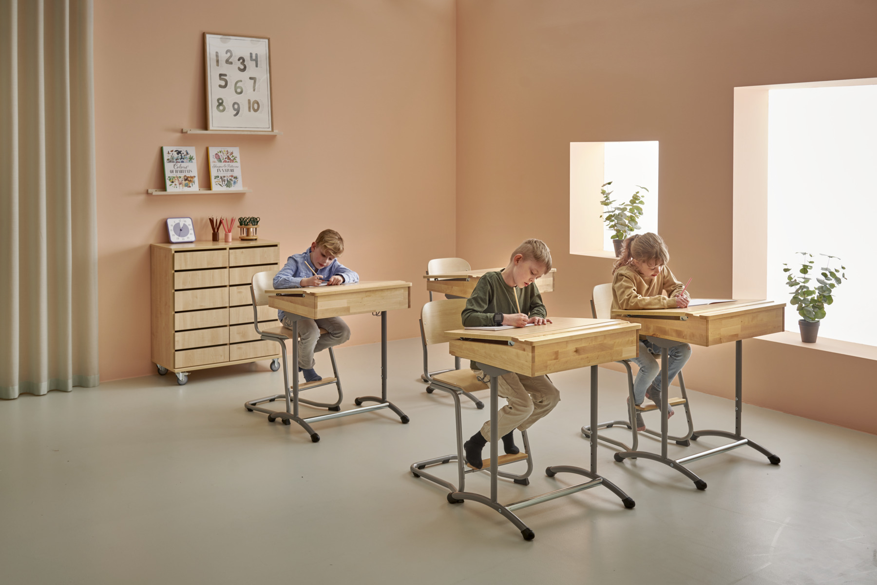 Locket kan vinklas 6 grader. Ställskruvar på främre benparet. Dubbla väskkrokar. Mått: B65xD55 cm. Mått på bänklock: B65xD42 cm. Ställbar i höjderna 64, 70, 76, 82 och 88 cm. Lådstomme och pennränna i björk. Bänklock i akustiklaminat. Stativ i silver, RAL 9006.