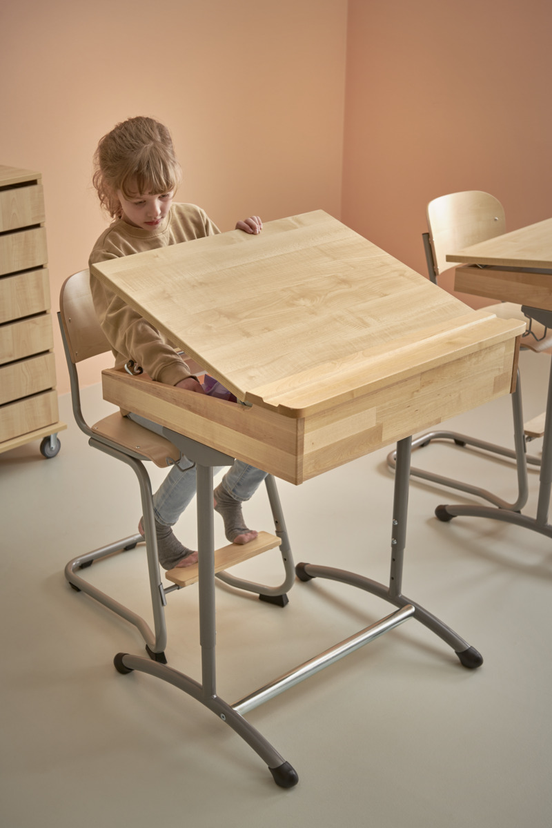 Locket kan vinklas 6 grader. Ställskruvar på främre benparet. Dubbla väskkrokar. Mått: B65xD55 cm. Mått på bänklock: B65xD42 cm. Ställbar i höjderna 64, 70, 76, 82 och 88 cm. Lådstomme och pennränna i björk. Bänklock i massiv björk. Stativ i silver, RAL 9006.