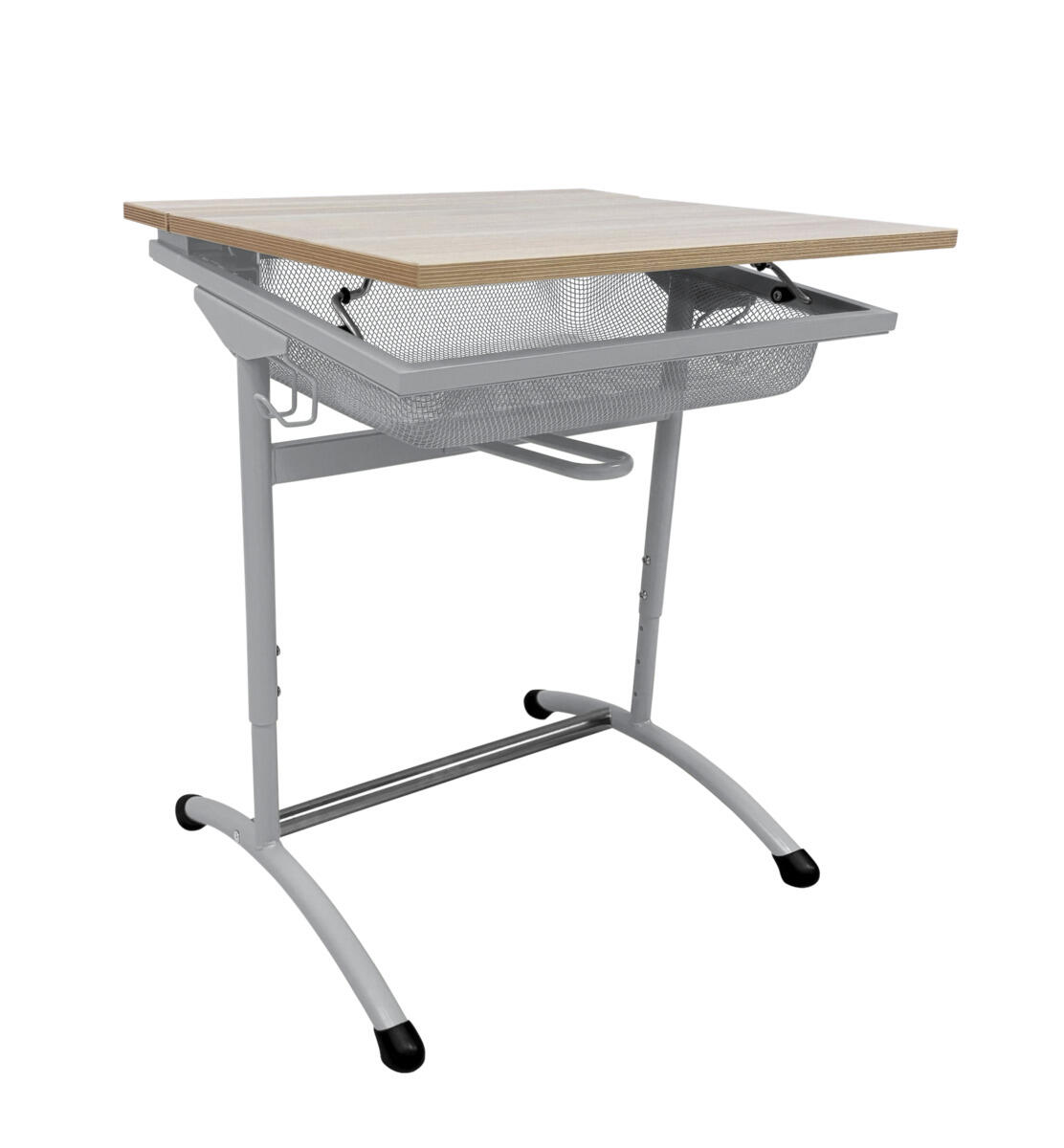 Skolbänk Mandal Mesh med ett högtryckslaminerat bänklock som går att vinkla för ergonomisk skriv- och ritställning. Stativet inkl. nätkorgen är pulverlackerat i silver, RAL 9006. Ställbar i de fasta höjderna 64, 69, 74, 79, 84, 89 & 94 cm. Tvärstag för extra stabilitet och hållfasthet. Nätkorgen under bänklocket ger en praktisk förvaring till böcker och skolmaterial. En väskkrok på vardera sida. Plastfötter med två ställbara tassar. Testad och godkänd enligt standard EN 1729-2:2023.