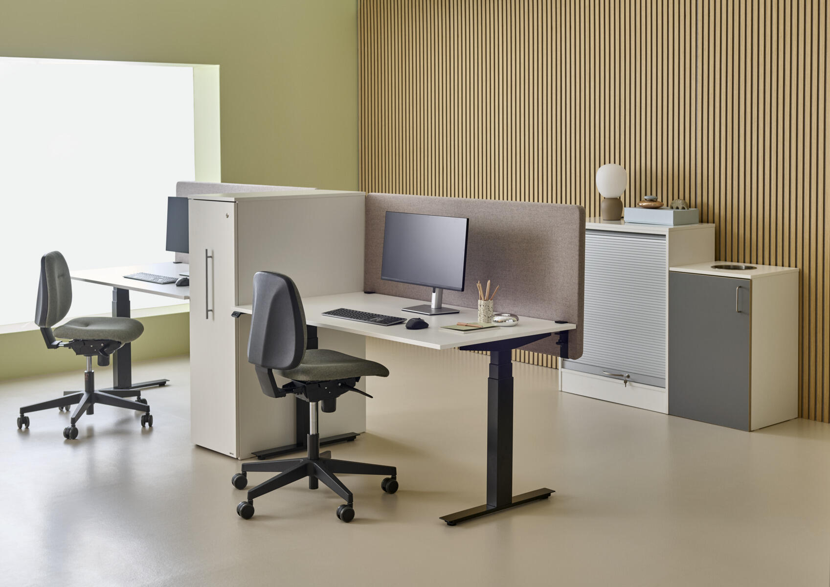 Work skrivbord har en bordsskiva i högtryckslaminat med ABS-kant. Med sitt breda justeringsintervall (615 - 1275 mm ±5 mm exkl.bordsskiva) kan skrivbordet enkelt anpassas för att möta olika användares behov. Den steglösa höjdjusteringen garanterar en smidig övergång mellan olika höjder, vilket gör det enkelt att växla mellan sittande och stående arbetsställningar. Skrivbordet är utrustat med anti-collision-funktion som känner av hinder när skrivbordet sänks eller höjs och reagerar snabbt genom att stoppa stativet. Stativet är utrustat med ställbara fötter för ojämnt underlag. Mått fot: L61xB6 cm.