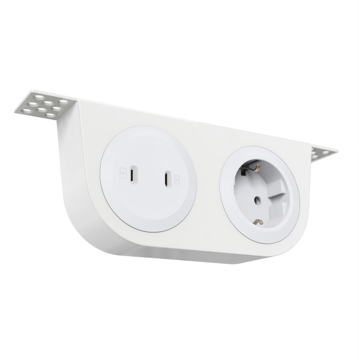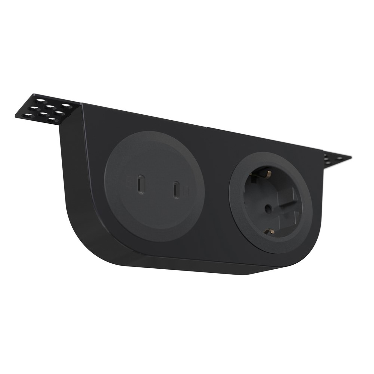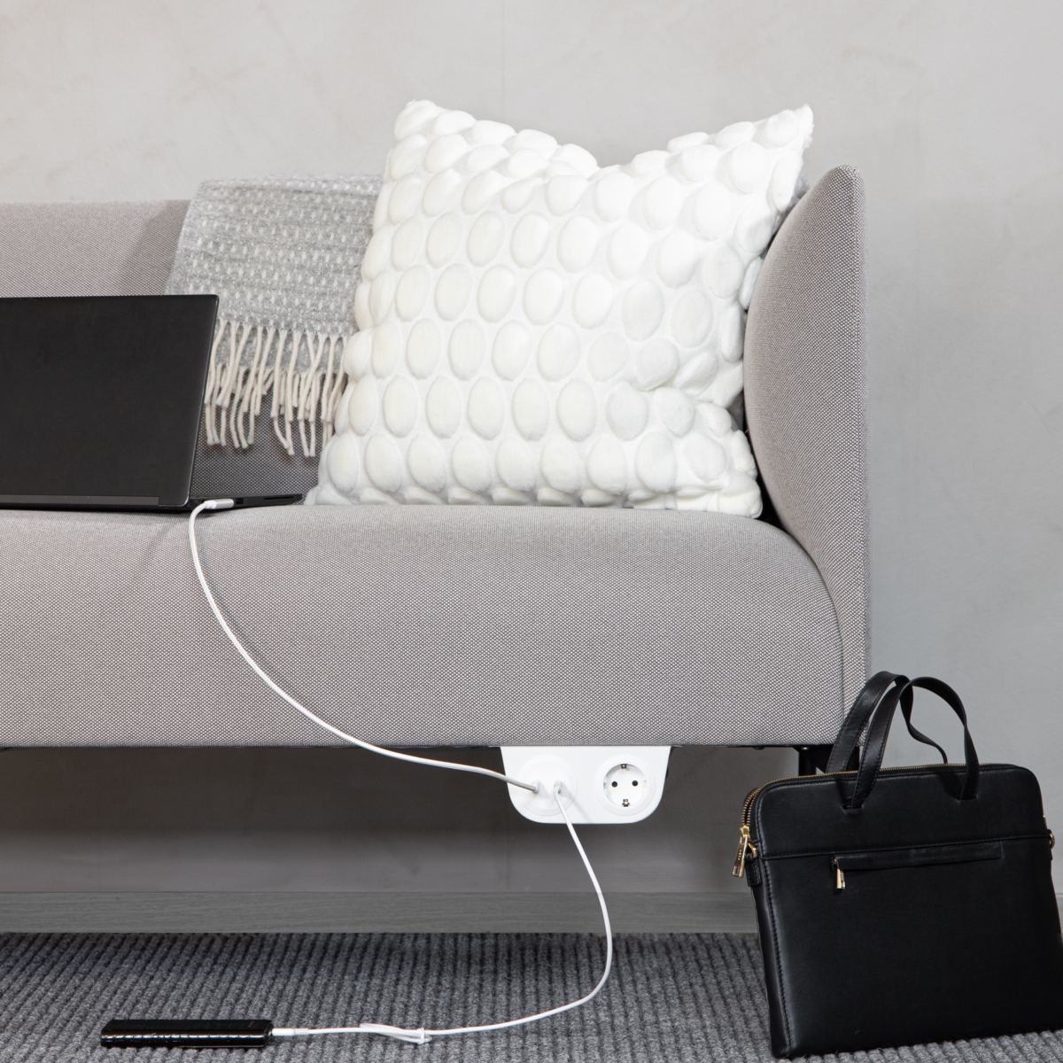 Konsol för montage under bordsskiva och sittmöbel inkl. 1 Powerdot Mini 1 elektrisk, 1 Powerdot Mini och 2 USB-C-laddare. Max uteffekt 30 W, 20 V, 1,5 A. Kabellängd 1,25 m.