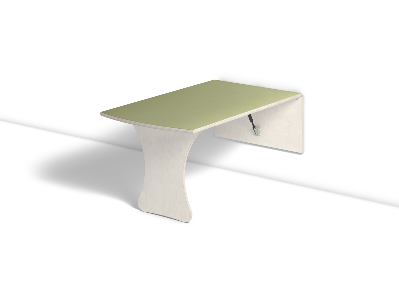 Vägghängande bord med låsanordning och dämpande gaskolvar, vilket ger ett säkert bord som fälls ned sakta och kontrollerat. Kräver montering. Vitpigmenterad björk. Bordsskiva med linoleum och lackad undersida. Djup från vägg i uppfällt läge: 55 mm.