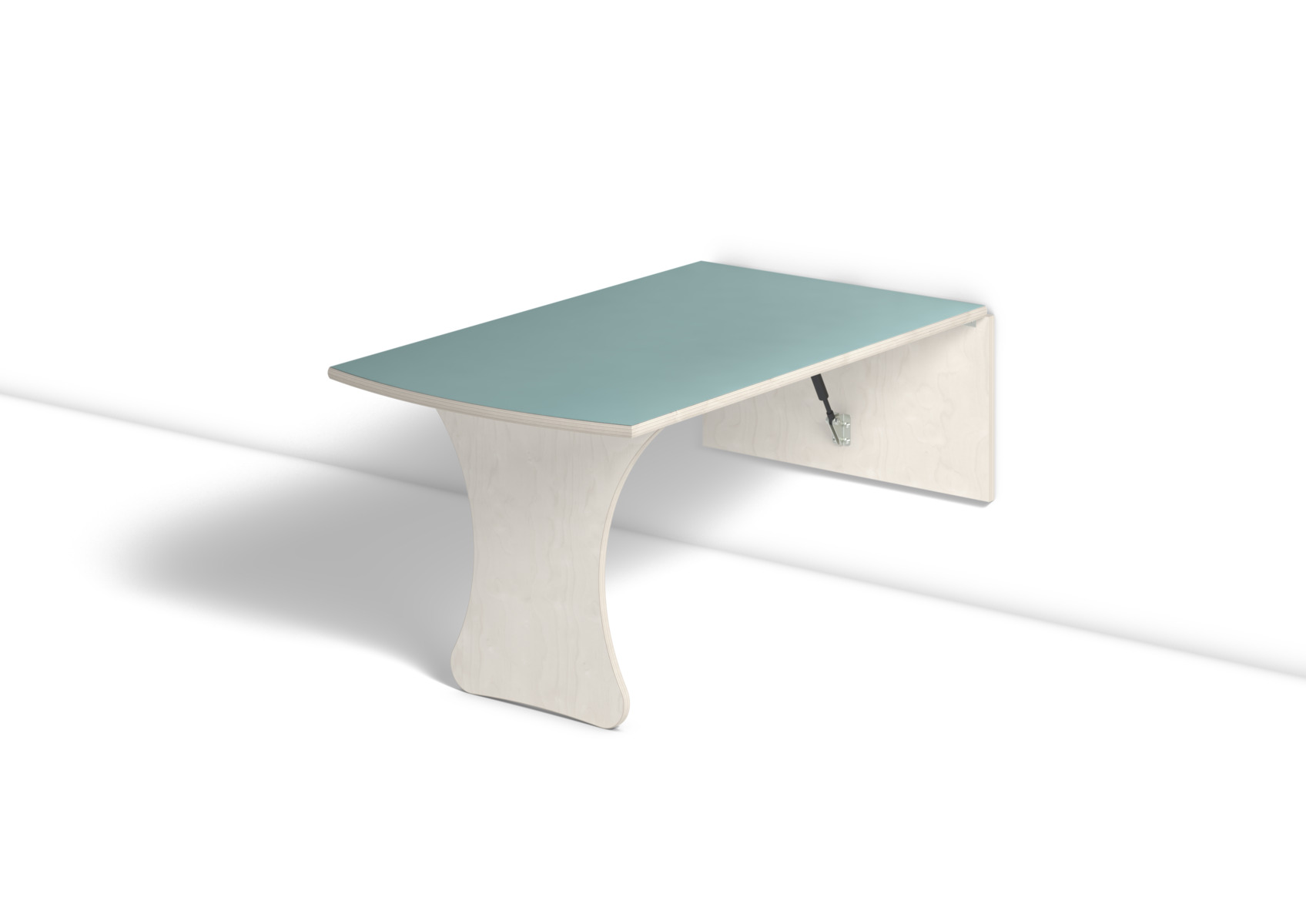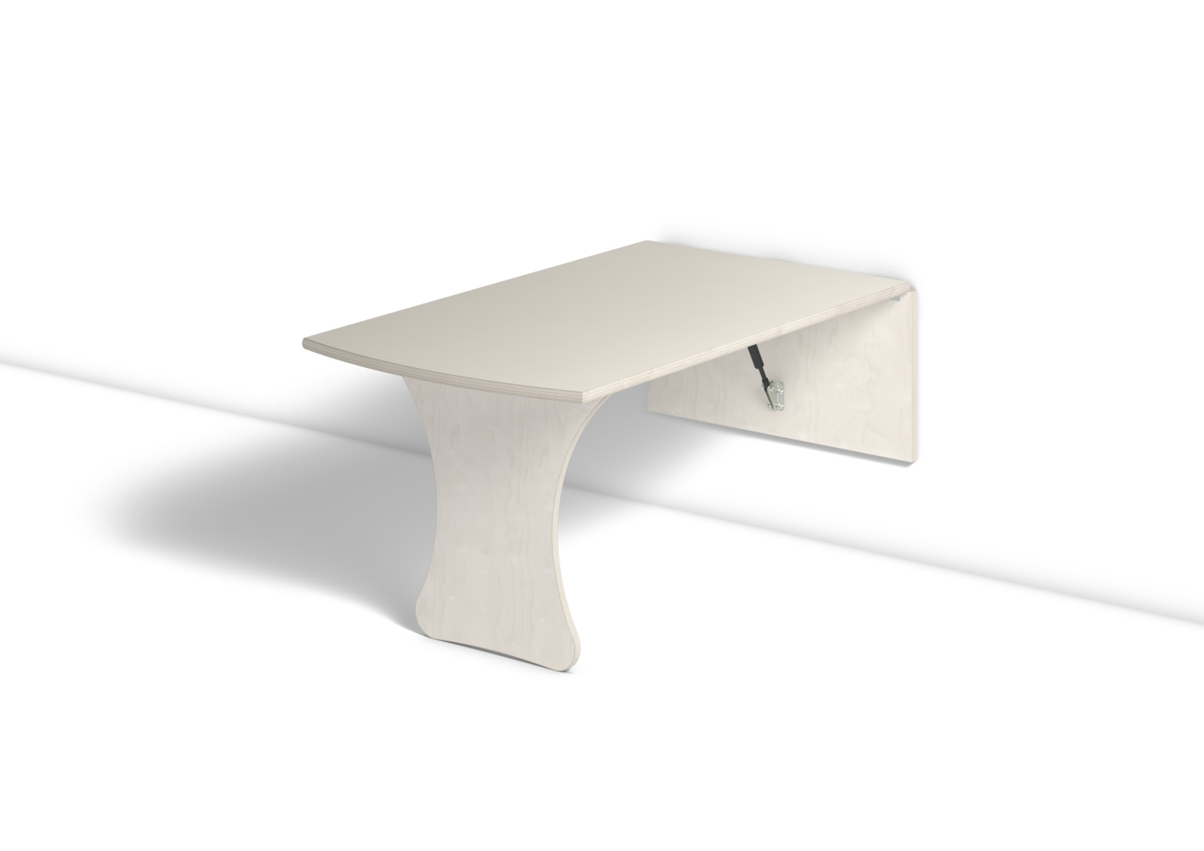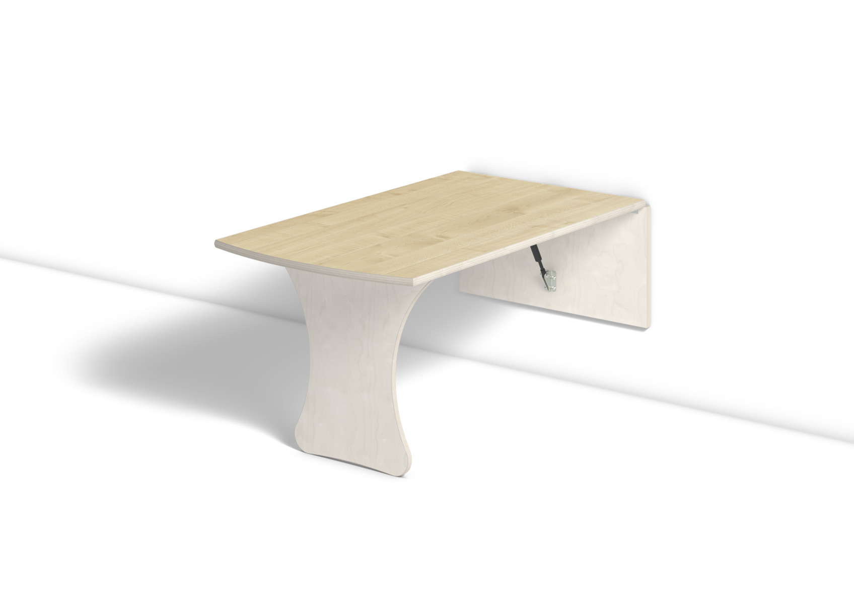 Vägghängande bord med låsanordning och dämpande gaskolvar, vilket ger ett säkert bord som fälls ned sakta och kontrollerat. Kräver montering. Klarlackad björk. Bordsskiva med laminat och lackad undersida. Djup från vägg i uppfällt läge: 55 mm.
