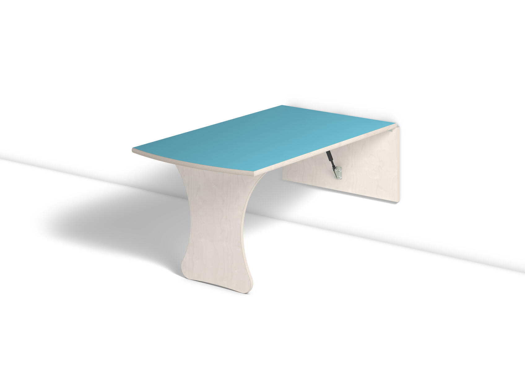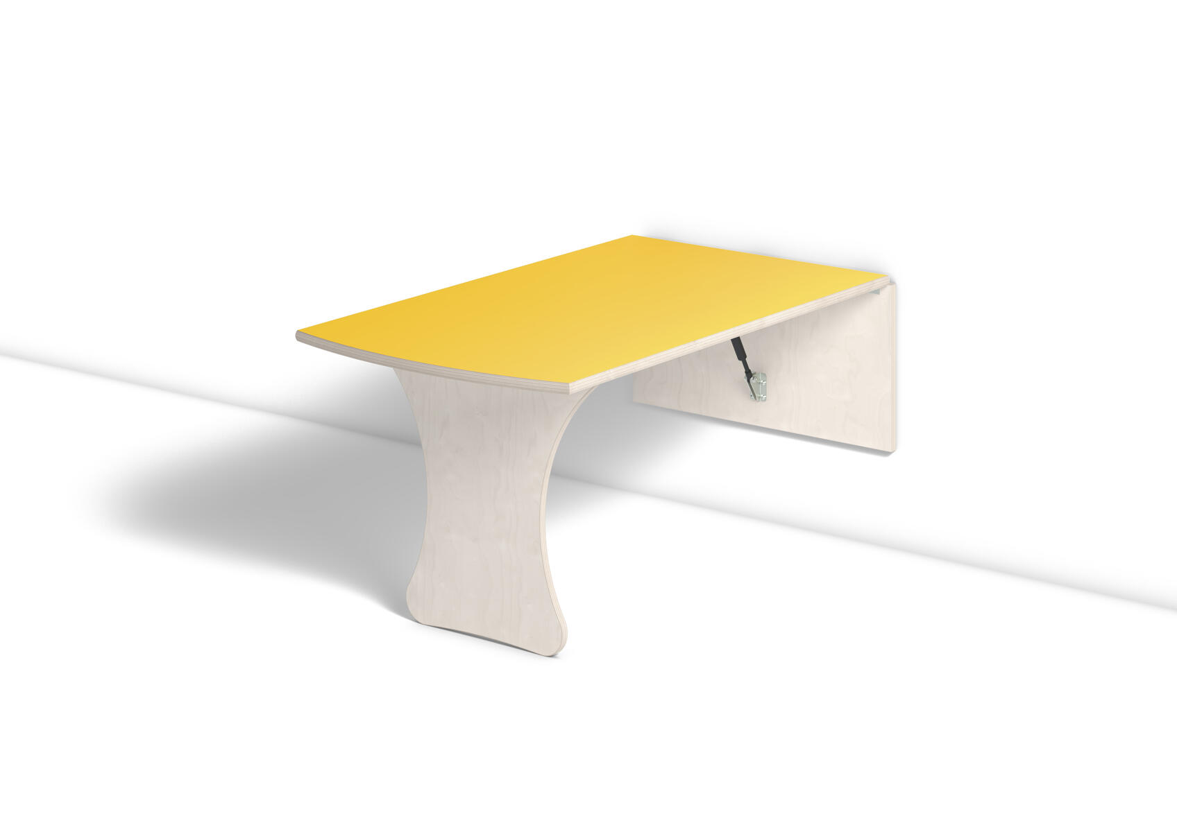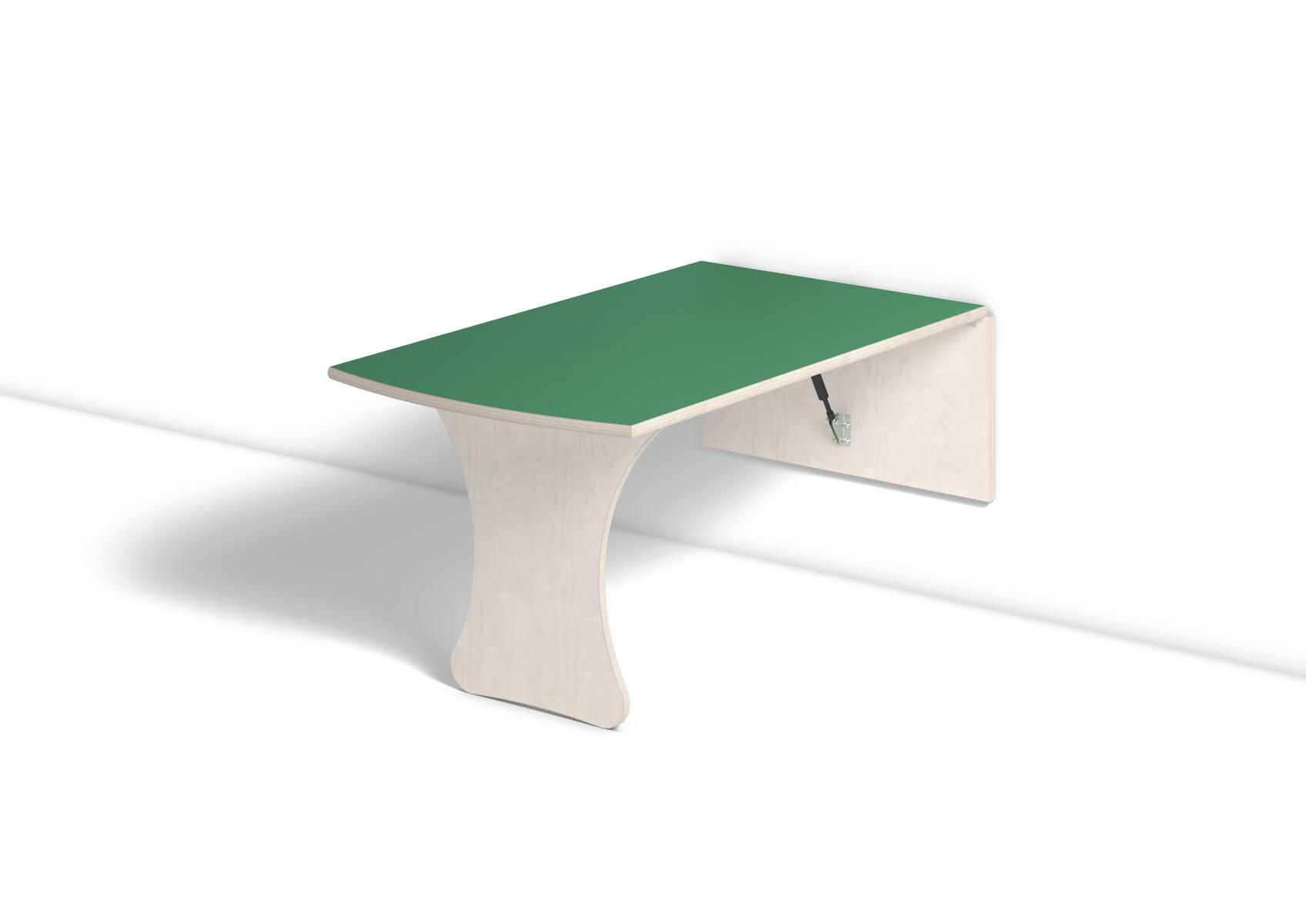 Vägghängande bord med låsanordning och dämpande gaskolvar, vilket ger ett säkert bord som fälls ned sakta och kontrollerat. Kräver montering. Vitpigmenterad björk. Bordsskiva med linoleum och lackad undersida. Integrerad sittbänk. Djup från vägg i uppfällt läge: 55 mm.