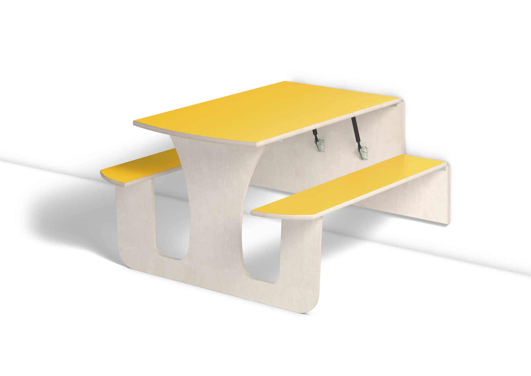 Vägghängande bord med låsanordning och dämpande gaskolvar, vilket ger ett säkert bord som fälls ned sakta och kontrollerat. Kräver montering. Vitpigmenterad björk. Bordsskiva med linoleum och lackad undersida. Integrerad sittbänk. Djup från vägg i uppfällt läge: 55 mm.