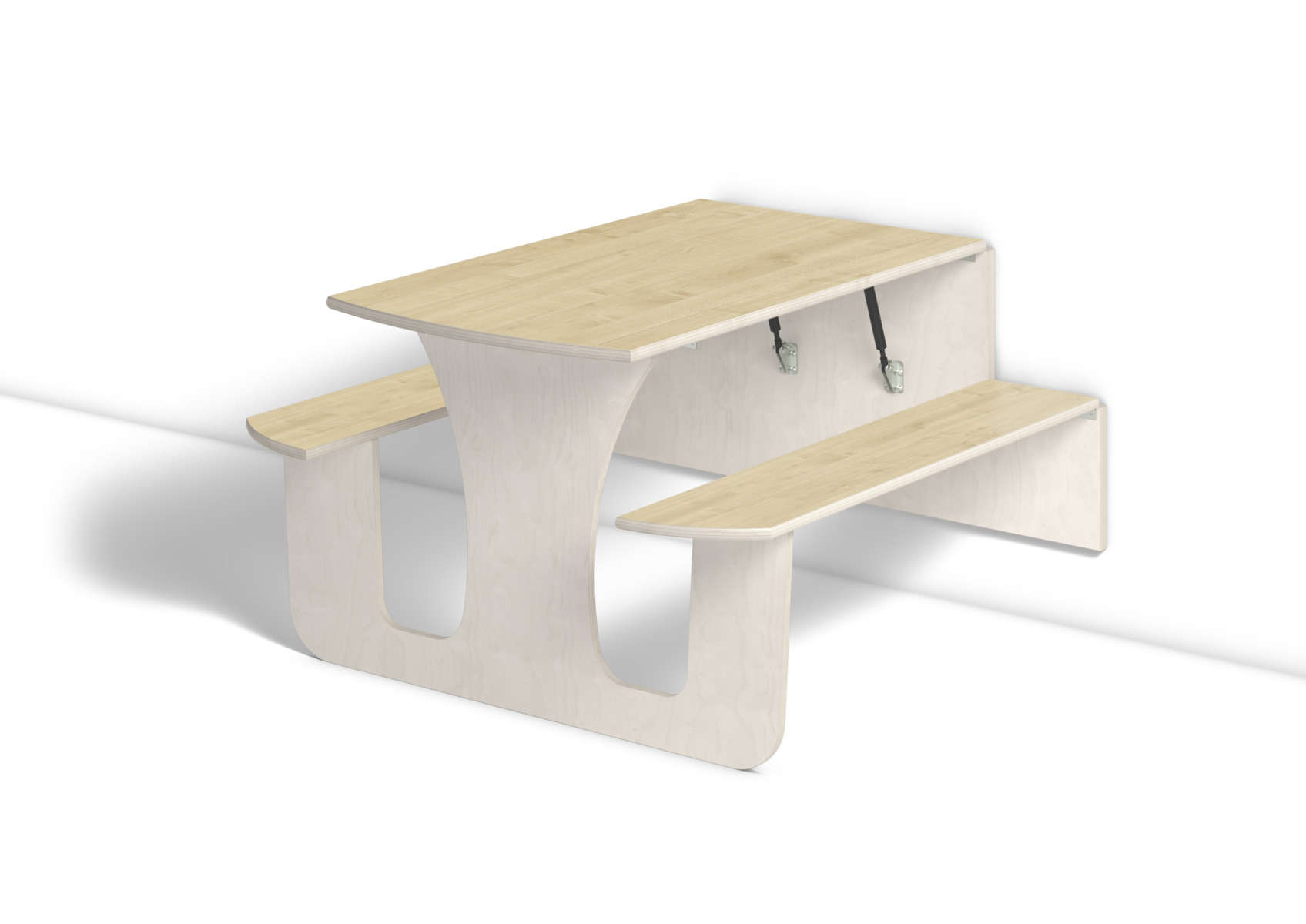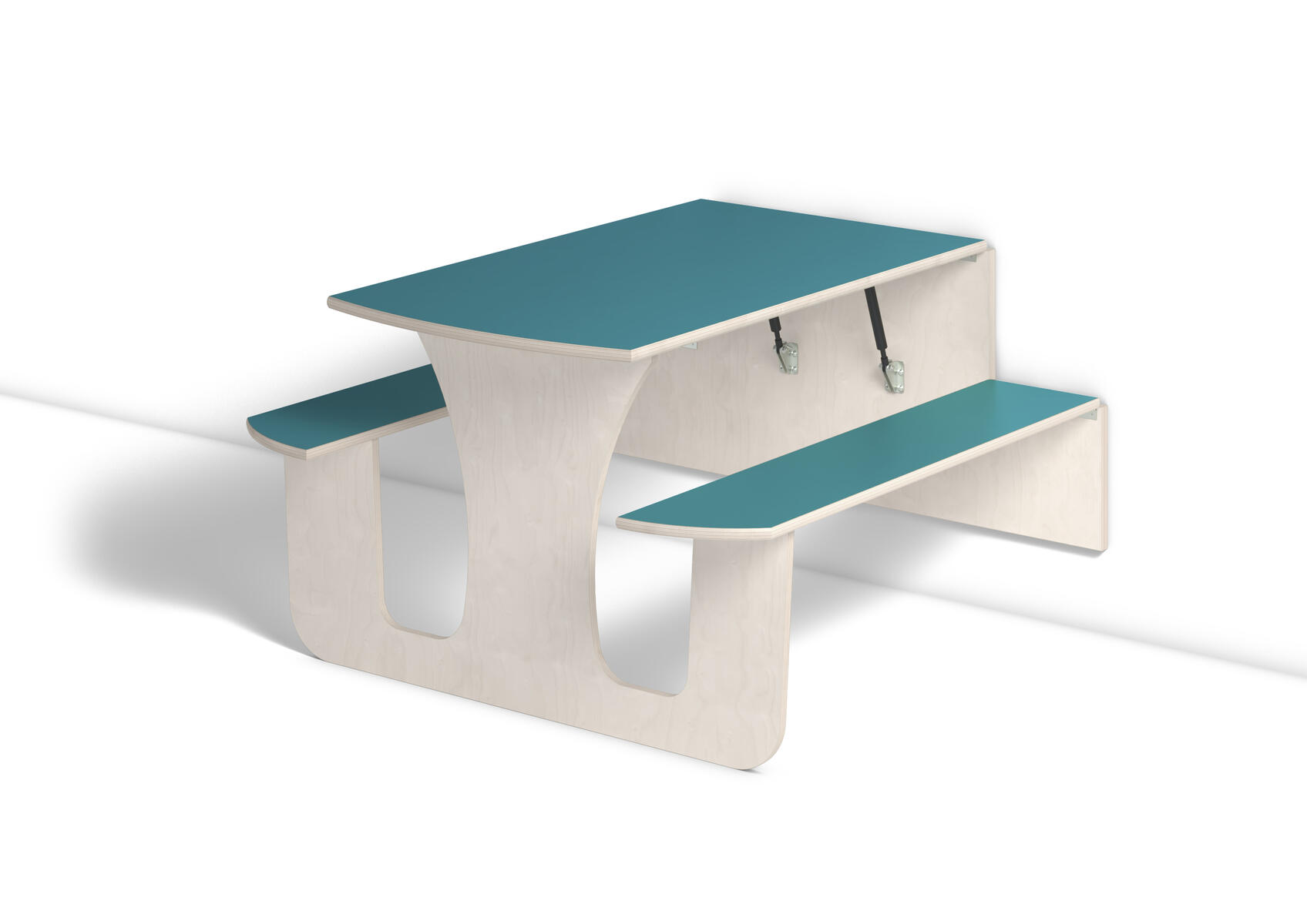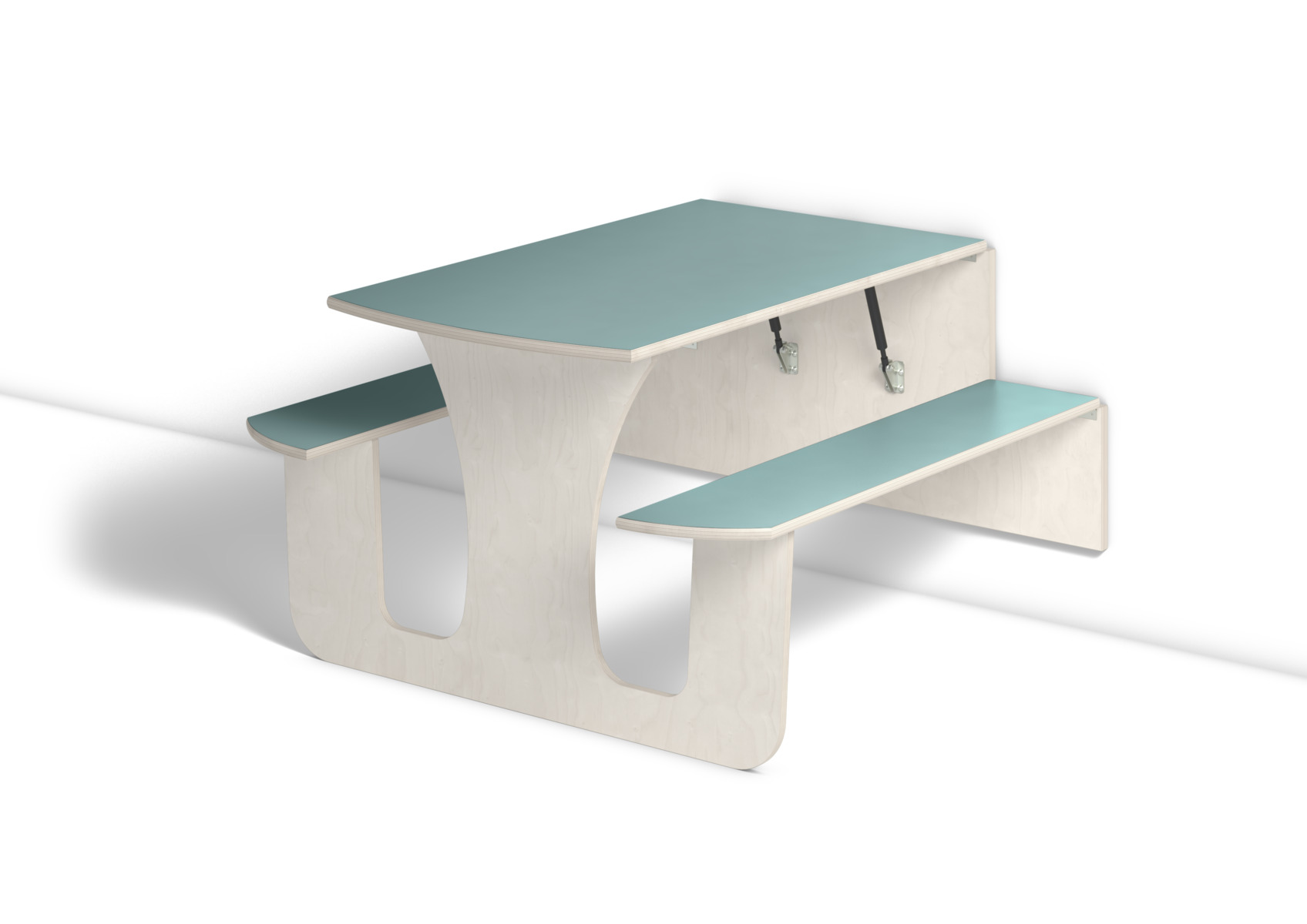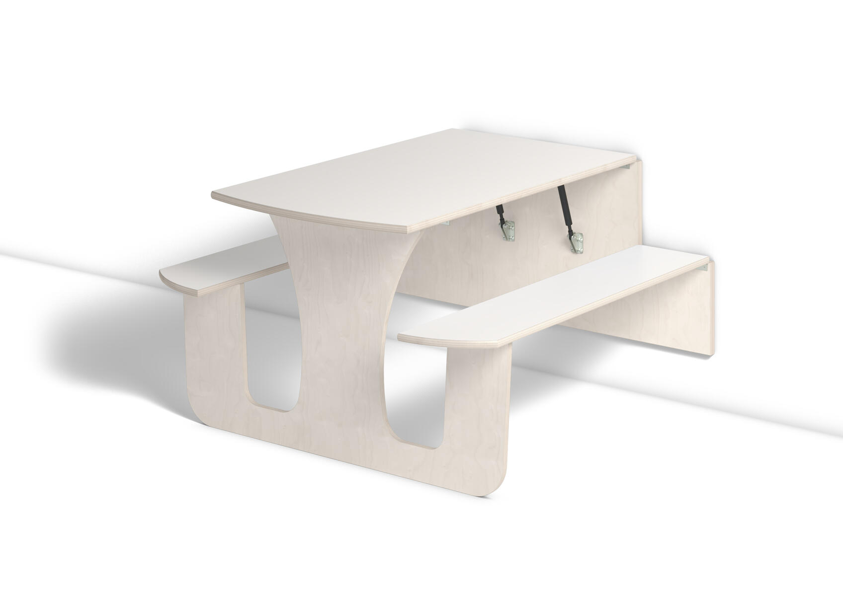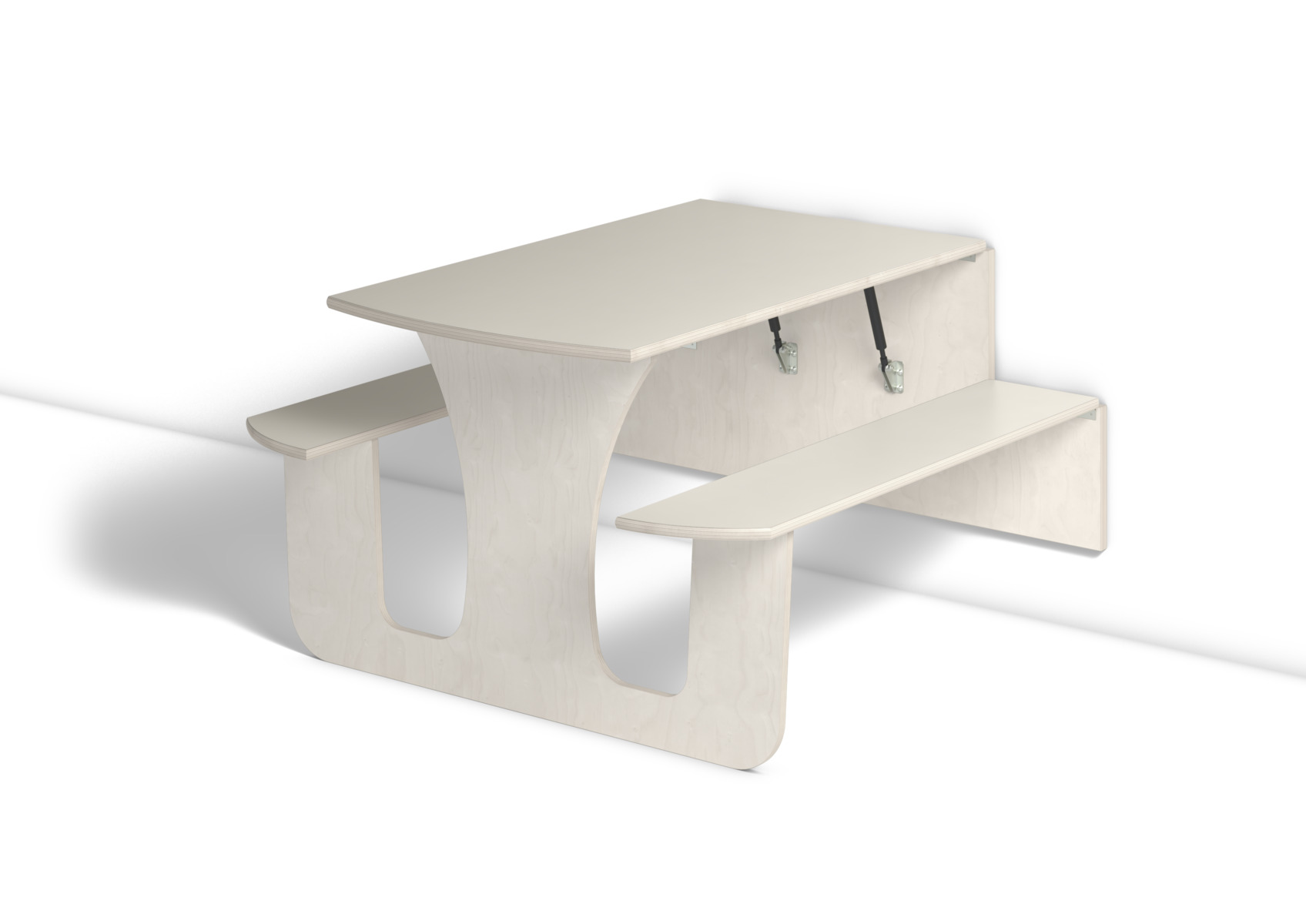 Vägghängande bord med låsanordning och dämpande gaskolvar, vilket ger ett säkert bord som fälls ned sakta och kontrollerat. Kräver montering. Vitpigmenterad björk. Bordsskiva med linoleum och lackad undersida. Integrerad sittbänk. Djup från vägg i uppfällt läge: 55 mm.