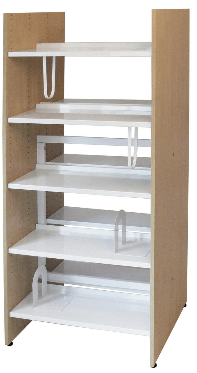 Bokhylla på sockel i direktlaminat. Inredd med 2 hyllplan och en tidskriftshylla.
