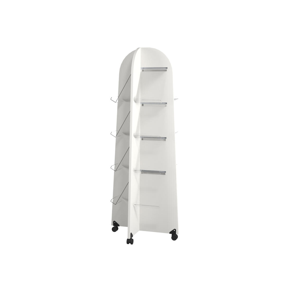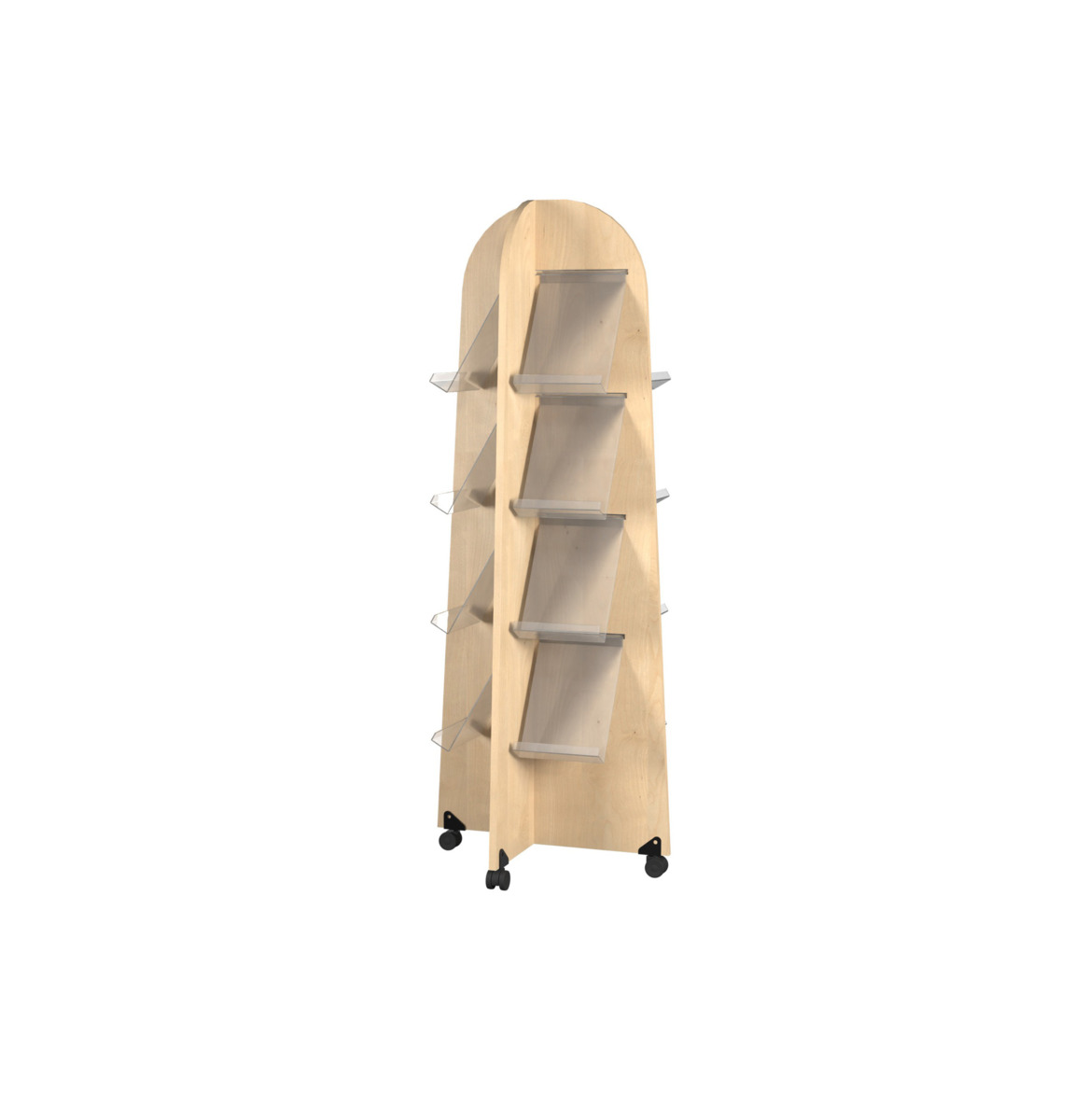 Bokvagn med 4 rörliga dubbelhjul varav 2 låsbara. Monterade vid leverans. Alla fyra sidor har 3 transparanta fack i A4-format och 3 hyllplan. Material: 18 mm spånskiva med laminat. Kantband i plywoodlook. Mått: H120x60x60 cm. Bottenplattan 69x69 cm. Hyllplan 27x27 cm. Höjd mellan hyllplan 35 cm. Från golv till bottenplattans ovandel 10 cm.