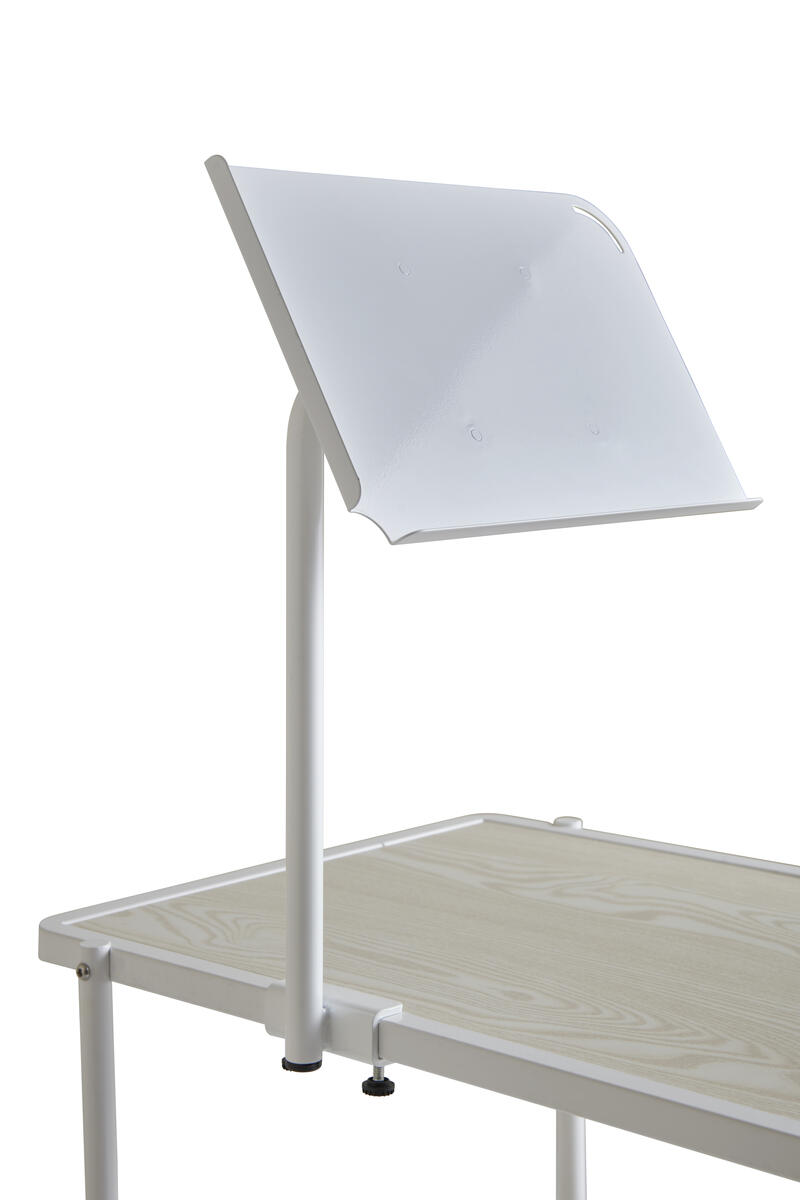 Fästs på vagnen. Kan justeras i olika lägen. Används både stående och liggande. Urtag för enklare grepp om pappret, enkel kant för att hålla papper på plat. Storlek A4. Mått: arm 25 cm, pennfack 7 cm, ø 18 mm, hållare B22 H30 cm.
