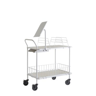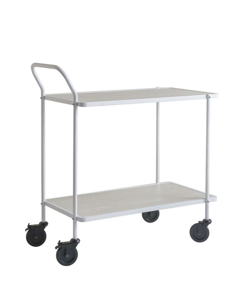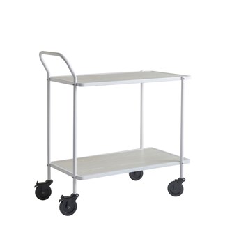 Stadig, tålig och lätt att hålla ren. Mått vagn: B76xD52xH83 cm. Avståndet mellan hyllplanen är 37 cm. Vikt 20 kg. Max belastning 100 kg. 2 låsbara hjul. Stomme av blålackerade stålrör och skivor i vitt laminat.