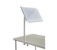 Fästs på vagnen. Kan justeras i olika lägen. Används både stående och liggande. Urtag för enklare grepp om pappret, enkel kant för att hålla papper på plat. Storlek A4. Mått: arm 25 cm, pennfack 7 cm, ø 18 mm, hållare B22 H30 cm.