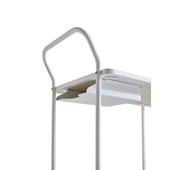 Smart liten vagn med plats för bra tillbehör, och fyra rörliga hjul. Höjd handtag 17 cm. Totalhöjd med handtag 89 cm. Höjd till översta avlastningsyta 72 cm, höjd till nedersta avlastningsyta 22 cm. Mellanrum avlastningsytor 50 cm. Totalbredd 43 cm, mått avlastningsyta 39 cm. Längd avlastningsyta 75 cm, totallängd avlastningsyta med handtag 86 cm. Hyllplan i spånskiva med laminat.