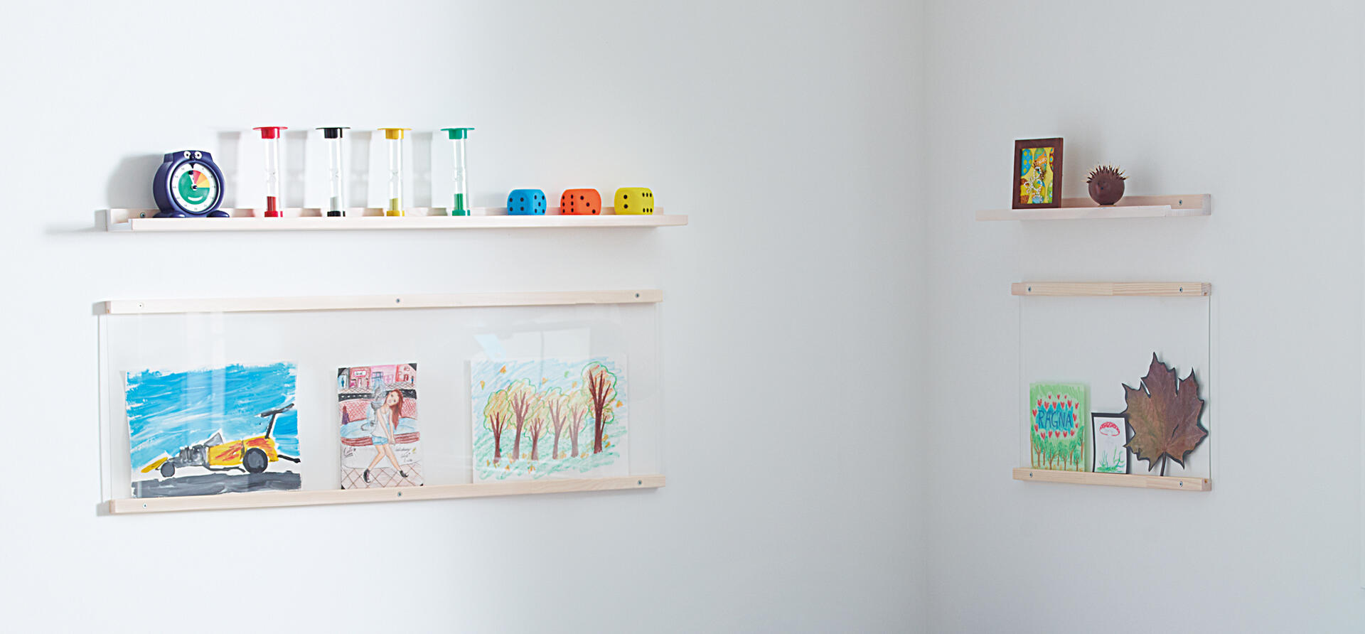 Smart hylla som kan användas till många olika saker t.ex. bokhylla, visning av konstverk, teckningar m.m. Finns i tre olika längder. Djup 9,5 cm. Vitpigmenterad i massiv trä.