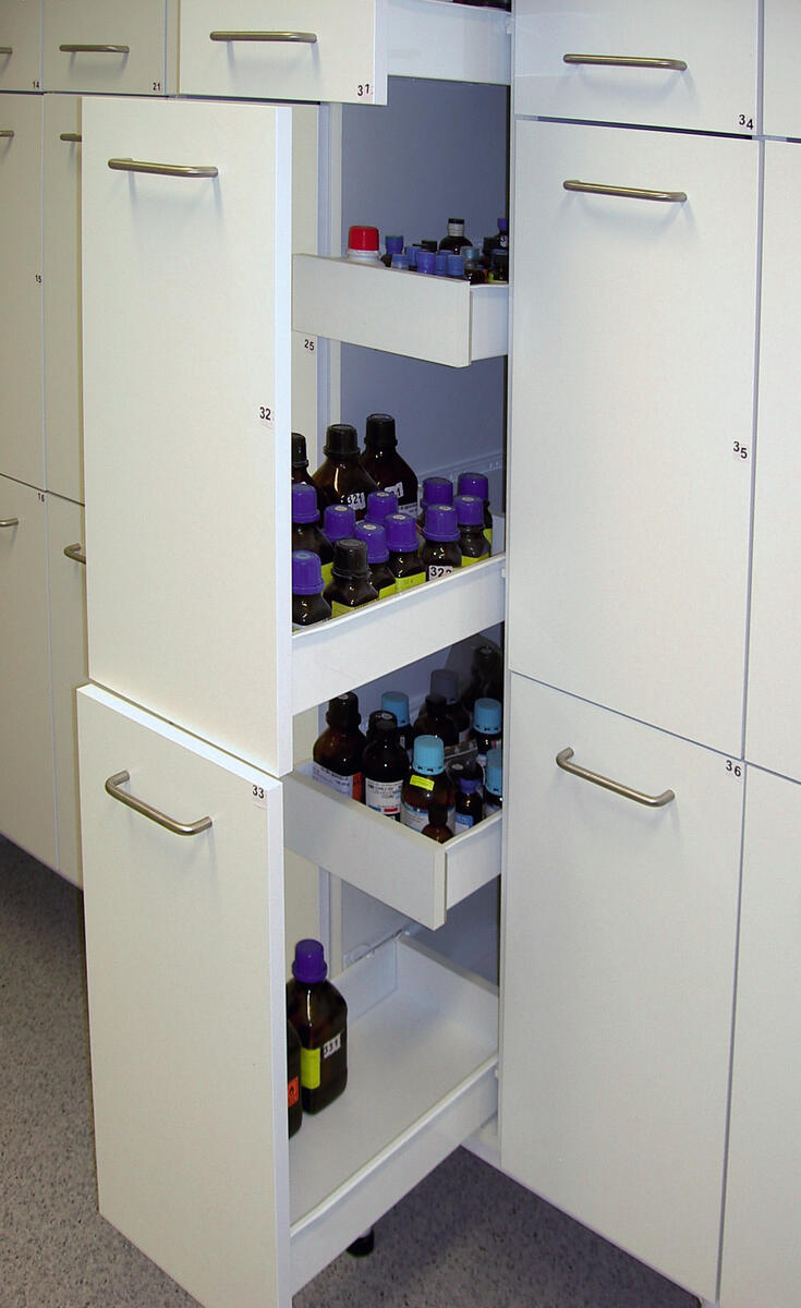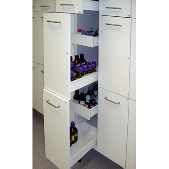 UKS-3/3 är ett utdragbart, ventilerat kemikalieskåp. Skåpet är avsett för förvaring av hälsovådliga kemikalier som skall förvaras i ventilerade förvaringsskåp, dock ej syror, baser eller brandfarliga kemikalier. Skåpets utformning med tre utdragbara fronter med bakomliggande lådor som är åtkomliga från båda håll ger en yteffektiv, lättöverskådlig och ergonomisk förvaring. I utdragbart läge är skåpet dimensionerat för en maximal belastning av 30 kg per låda. Skåpet är utrustat med genomgående ventilationskanal, vilket garanterar en jämn genomluftning av hela skåpet. Mått: 30x60x210 cm. Rekommenderat luftflöde: 14 l/s. Dimensionerat tryckfall Ps Ca: 20 Pa.