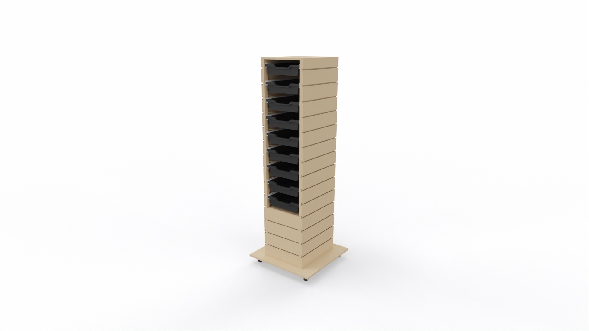 Creo torn med hjul, 2 fasta och 2 rörliga låsbara. Tillverkat av 30 mm olackerad björkplywood. Avståndet mellan skenorna är 10 cm. Nedersta plattan är 60x60 cm. Tillbehör köps separat. Har spår för upphängning och plats för plastlådor. Plats för Gratnellådor i tornet: 9 små 7,5 cm, 4 stora 15 cm. OBS: köp även till de antal skenor som önskas.
