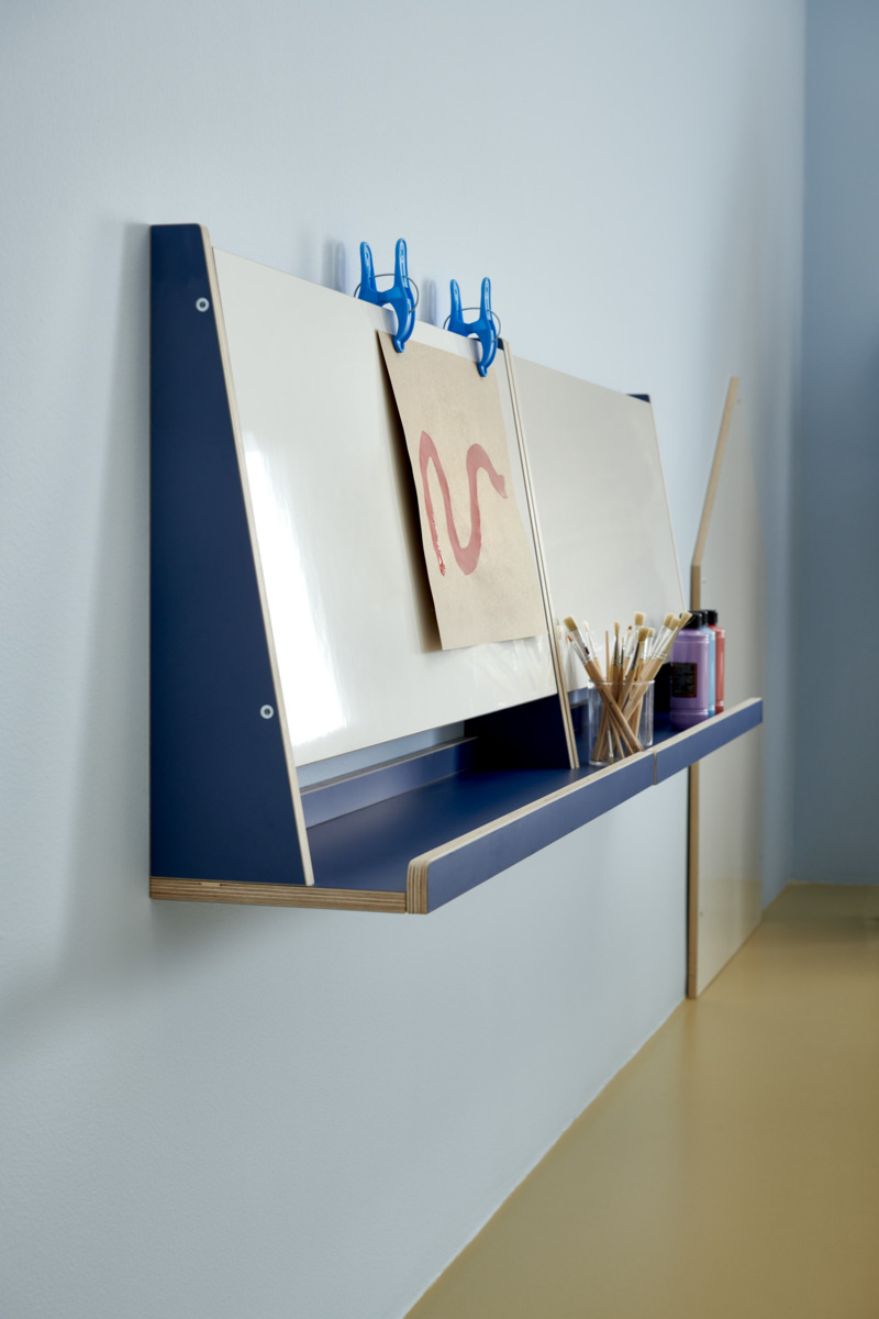 Ett väggstaffli där flera barn kan skapa samtidigt. Sluttande målaryta, som mest utfällt från vägg ca 20 cm. 3 praktiska plasthyllor för förvaring av t.ex. penslar och färger ingår. Mått: 187x75(100 inkl hylla) cm. Björkmelamin. Med plats för upp till 3 barn. Hyllan medföljer. Avståndet mellan plasthyllorna och nedre hyllorna är 25 cm.