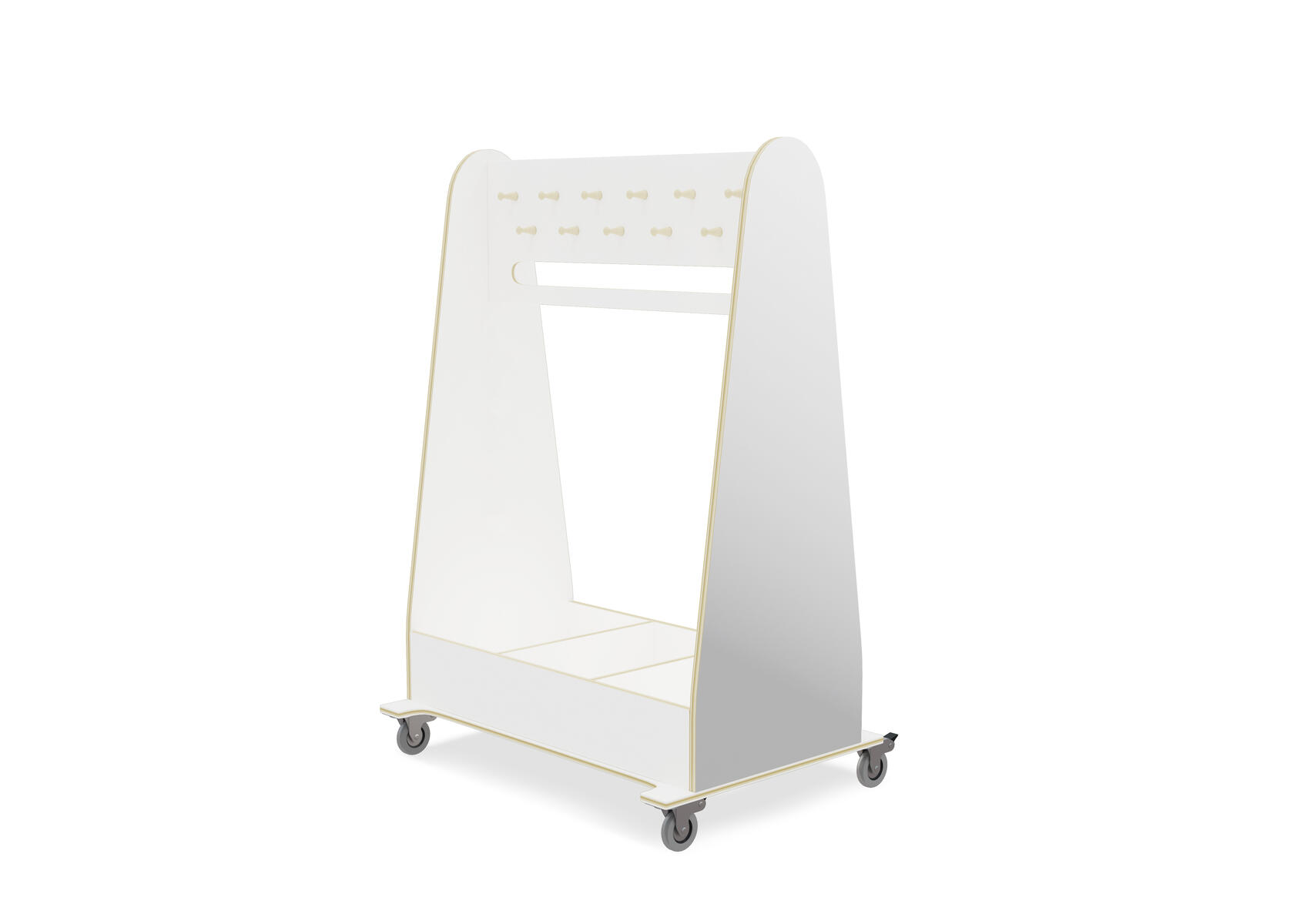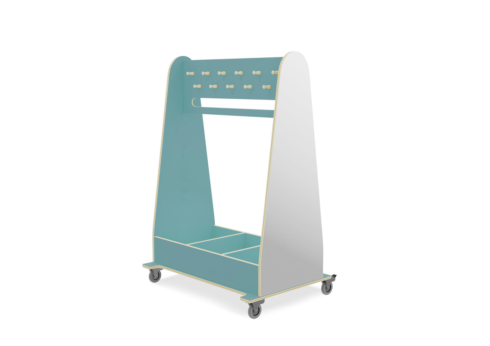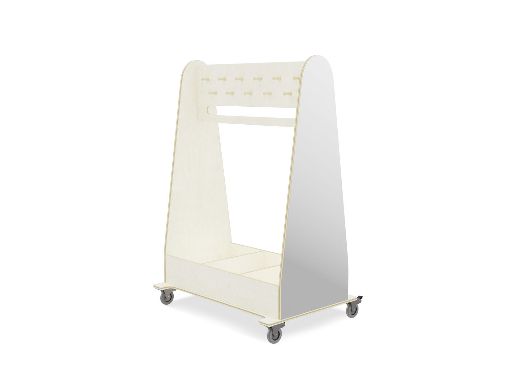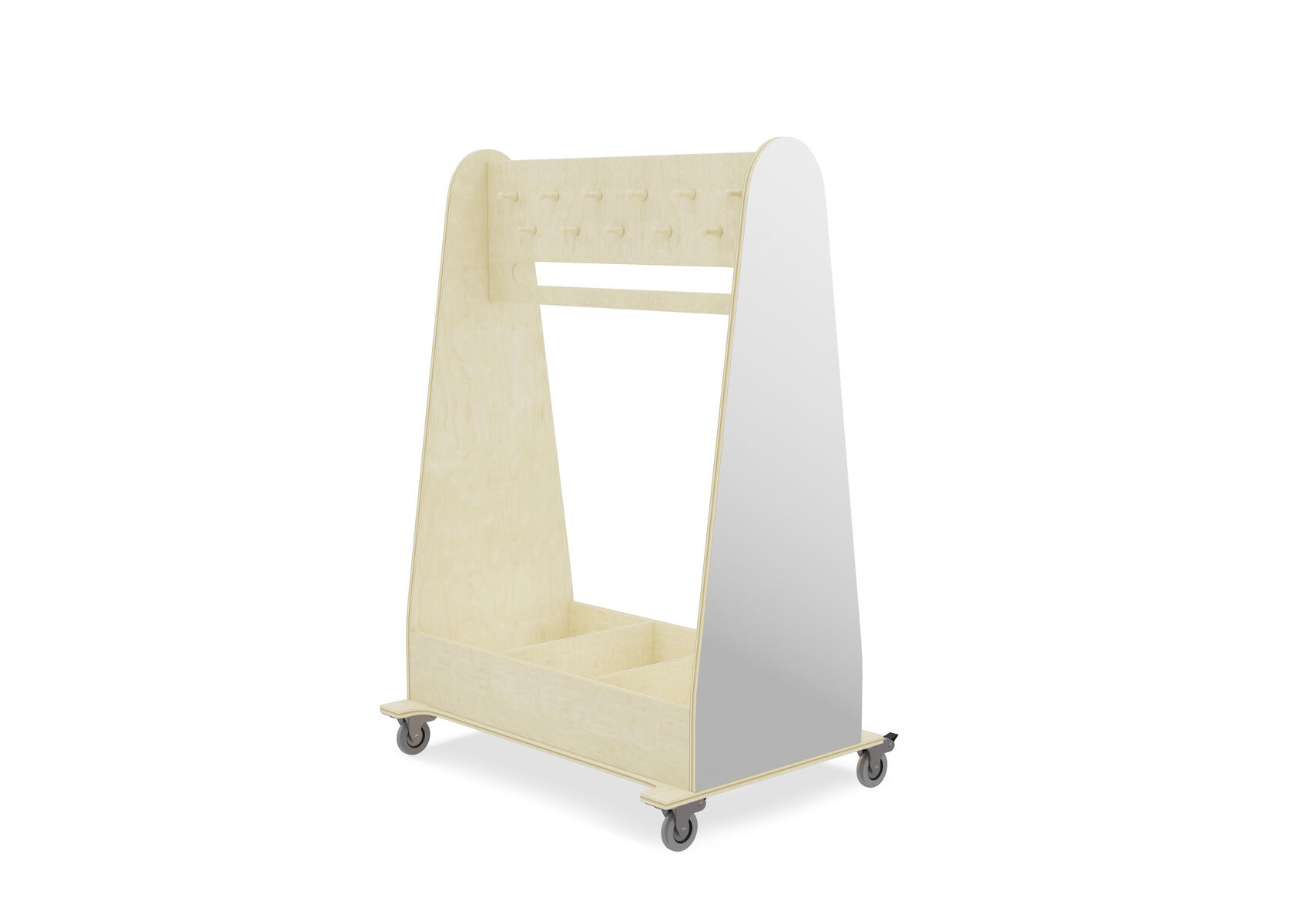 Utklädningsvagn med små förvaringsfack. Färdig modul i 16 mm björkplywood. Färger med HT är med högtryckslaminat. Björk och vitpigmenterad är helt i 18 mm plywood. Detta är den stora av de två vi erbjuder i vår serie Fixa play. Fina små krokar längs insidan och även upptill, upphängning för galge. Hjul med lås kräver montering. Små förvaringsfack nertill i förvaringen. Spegel i akryl på utsidan av båda sidor. Mått: B88xD46/60xH127 cm.