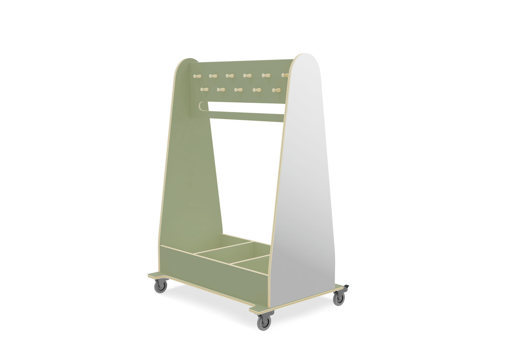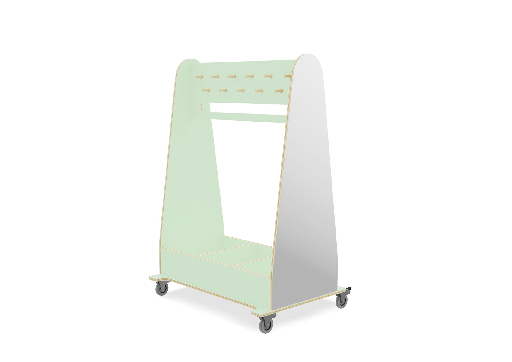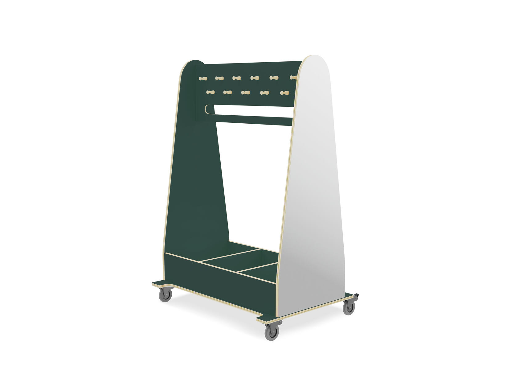 Utklädningsvagn med små förvaringsfack. Färdig modul i 16 mm björkplywood. Färger med HT är med högtryckslaminat. Björk och vitpigmenterad är helt i 18 mm plywood. Detta är den stora av de två vi erbjuder i vår serie Fixa play. Fina små krokar längs insidan och även upptill, upphängning för galge. Hjul med lås kräver montering. Små förvaringsfack nertill i förvaringen. Spegel i akryl på utsidan av båda sidor. Mått: B88xD46/60xH127 cm.
