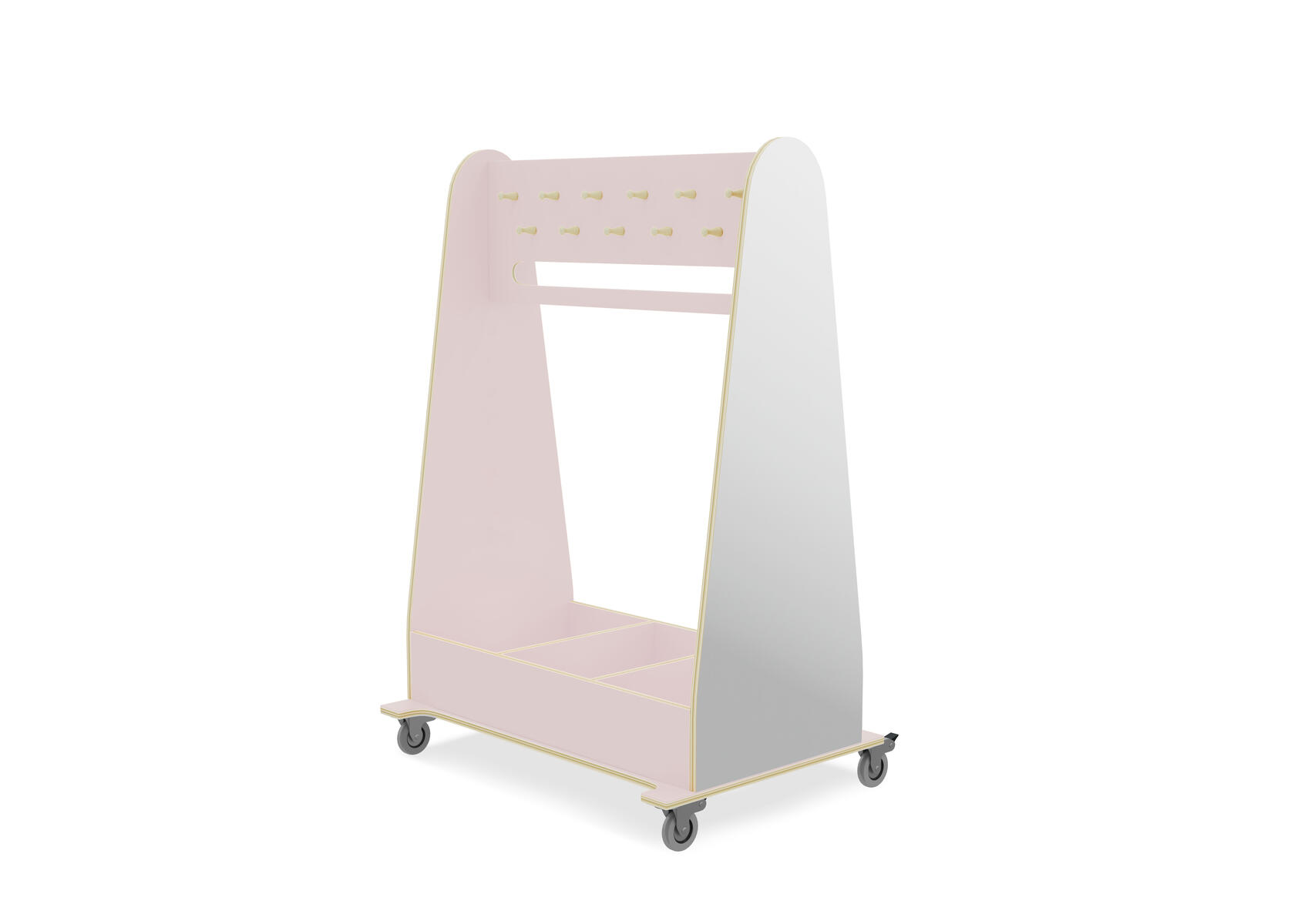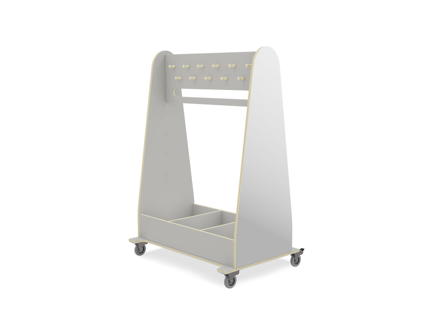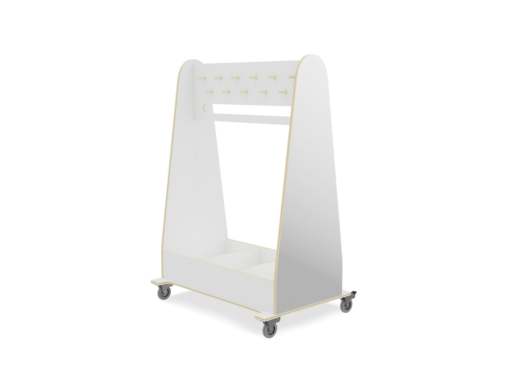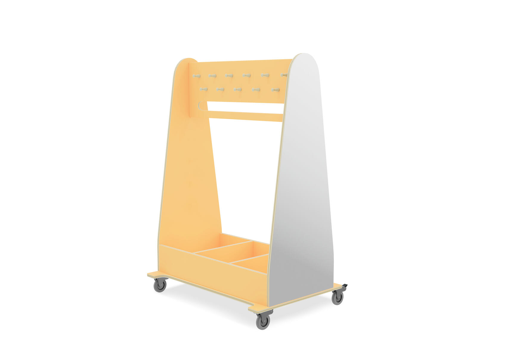 Utklädningsvagn med små förvaringsfack. Färdig modul i 16 mm björkplywood. Färger med HT är med högtryckslaminat. Björk och vitpigmenterad är helt i 18 mm plywood. Detta är den stora av de två vi erbjuder i vår serie Fixa play. Fina små krokar längs insidan och även upptill, upphängning för galge. Hjul med lås kräver montering. Små förvaringsfack nertill i förvaringen. Spegel i akryl på utsidan av båda sidor. Mått: B88xD46/60xH127 cm.