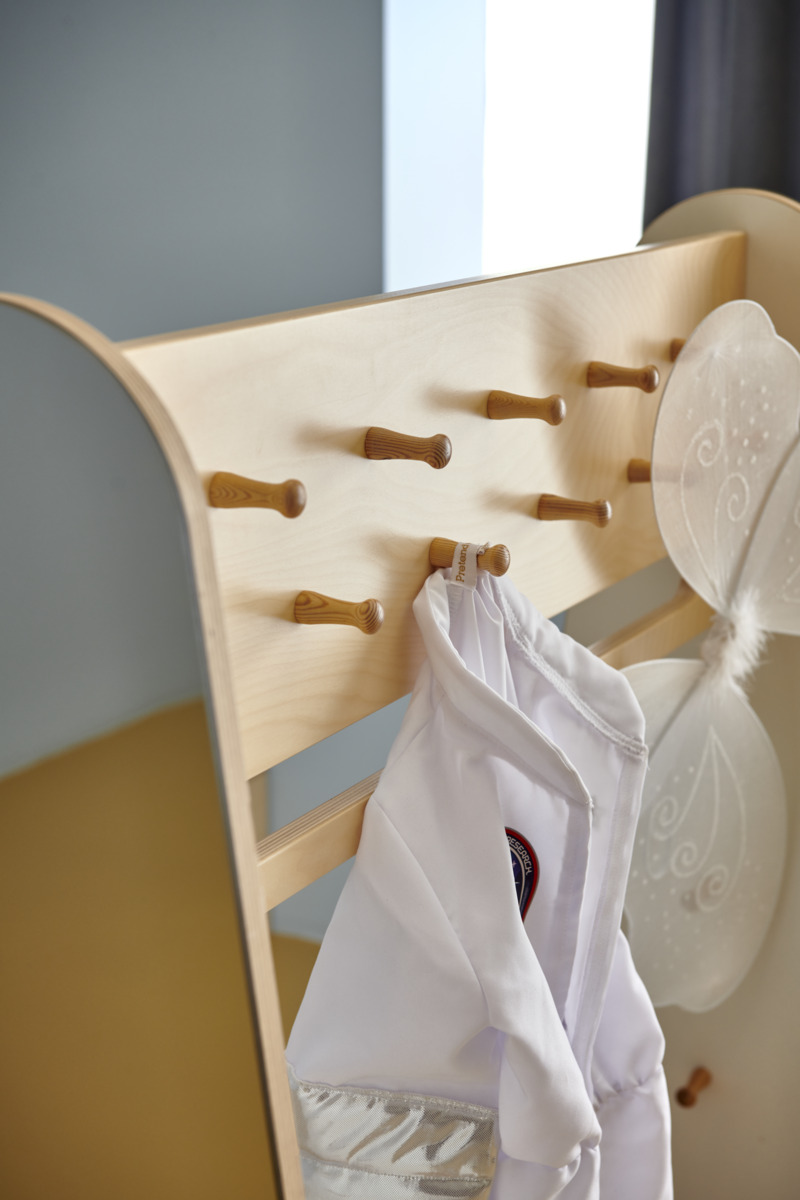 Håll ordning på alla utklädningskläder med den här praktiska klädställningen och de 5 hängarna. Längst ner finns en hylla av tyg för det som inte går att hänga. Mått: 120x60x30 cm. Av trä och bomull. PVC-fri. Monteringsanvisning medföljer. Från 3 år.