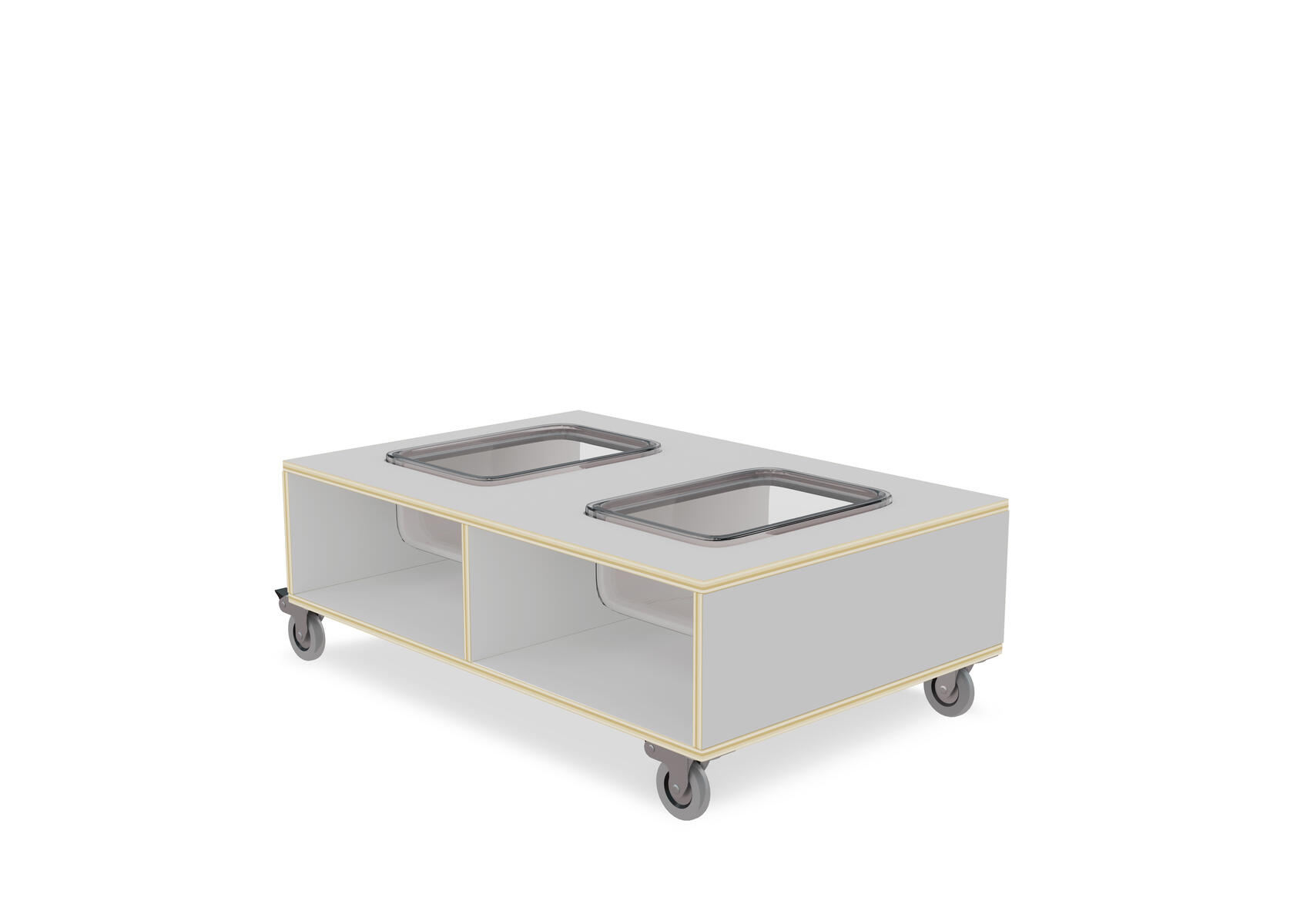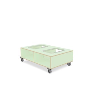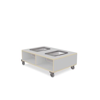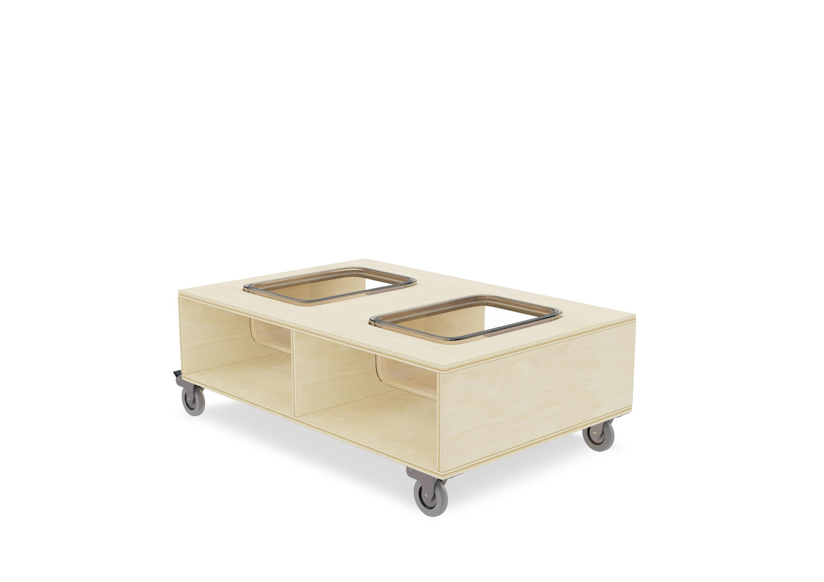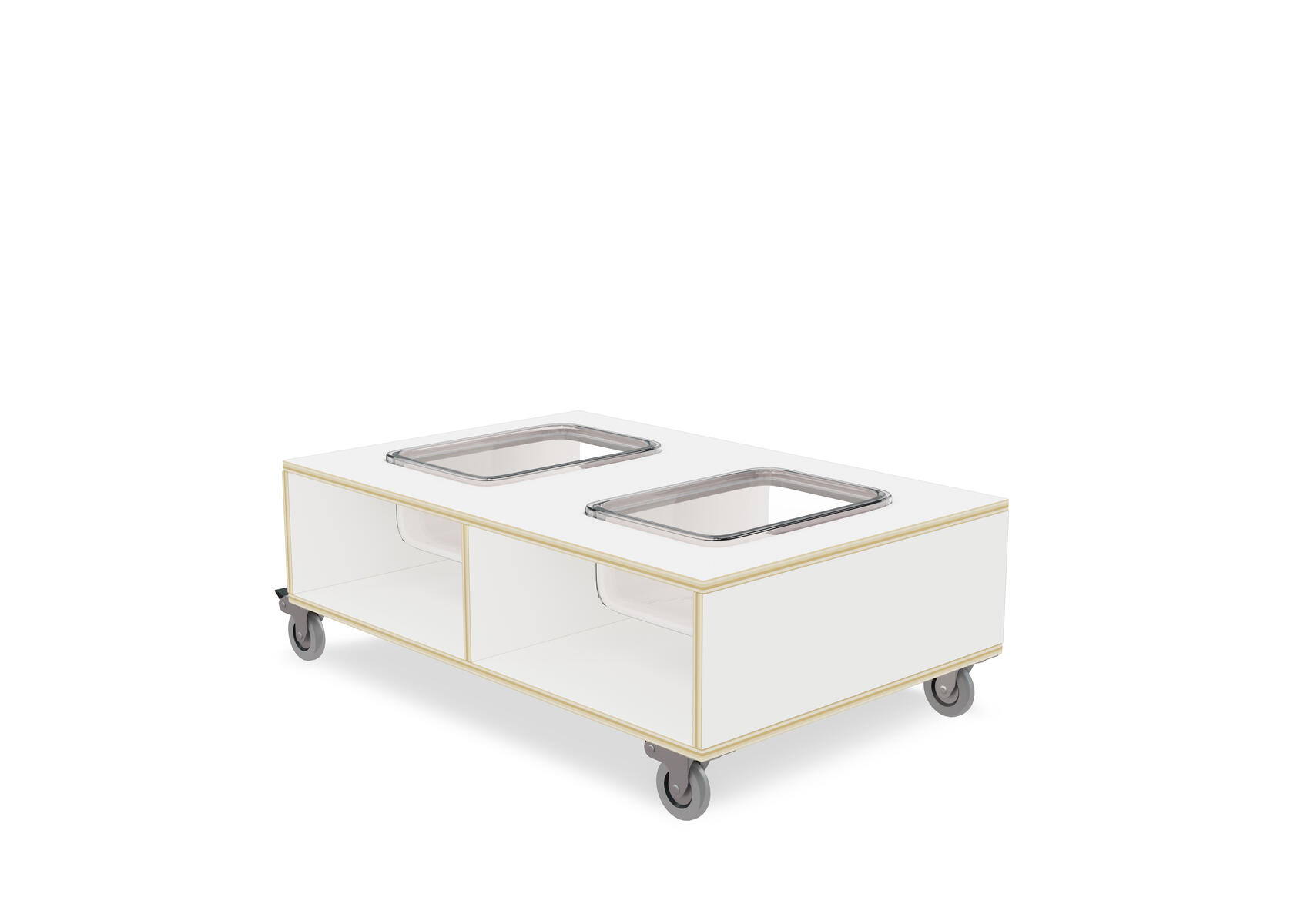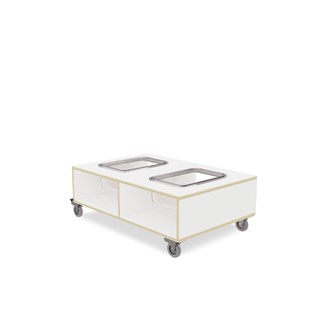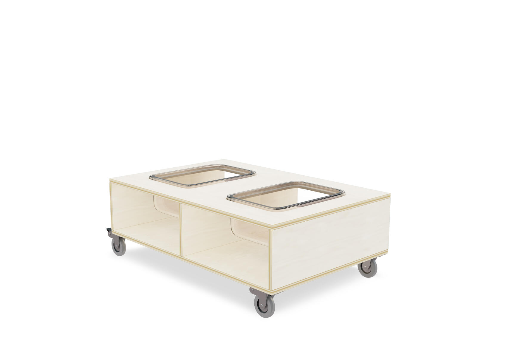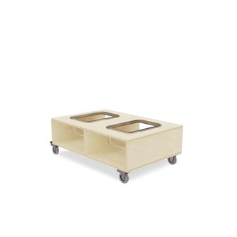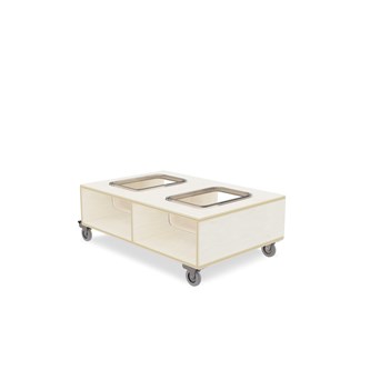 Färdig öppen modul, som levereras komplett med plastback och lock. Hjul med lås kräver montering. Borden finns i två höjder. De sensoriska lekborden är gjorda i 16 mm björkplywood. Färger med HT är med högtryckslaminat. Björk och vitpigmenterad är helt i 18 mm plywood. Plastback med lock mått B39xL29xD12,5 cm. Mått: B88xD58xH31 cm.