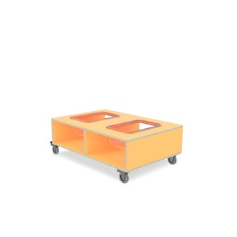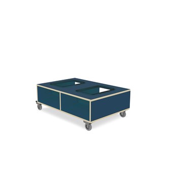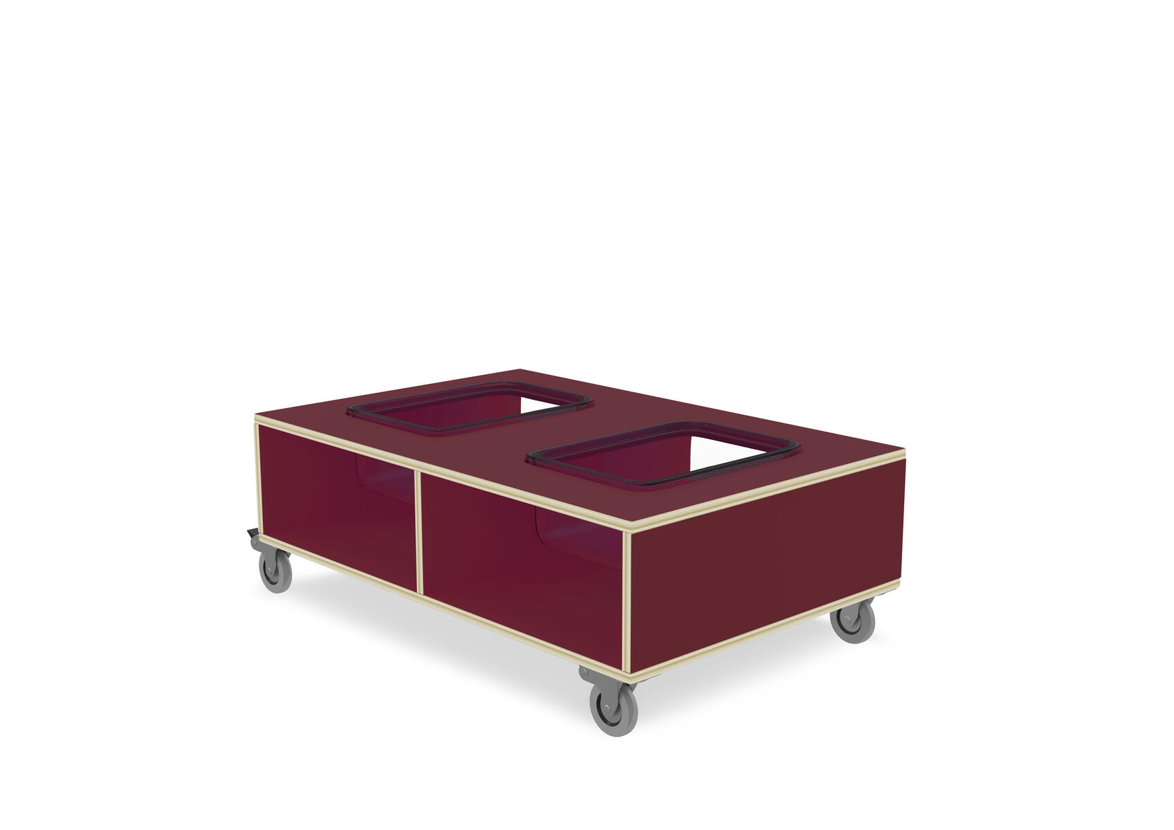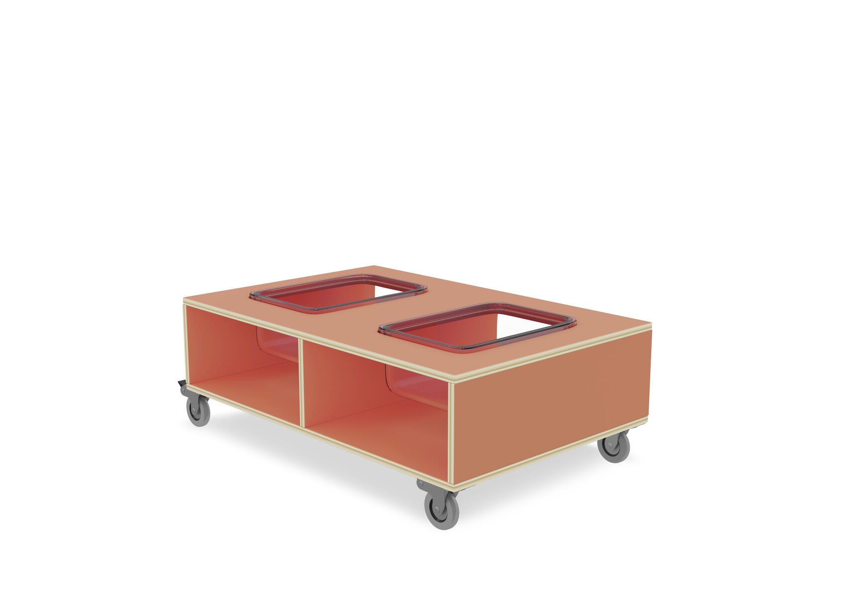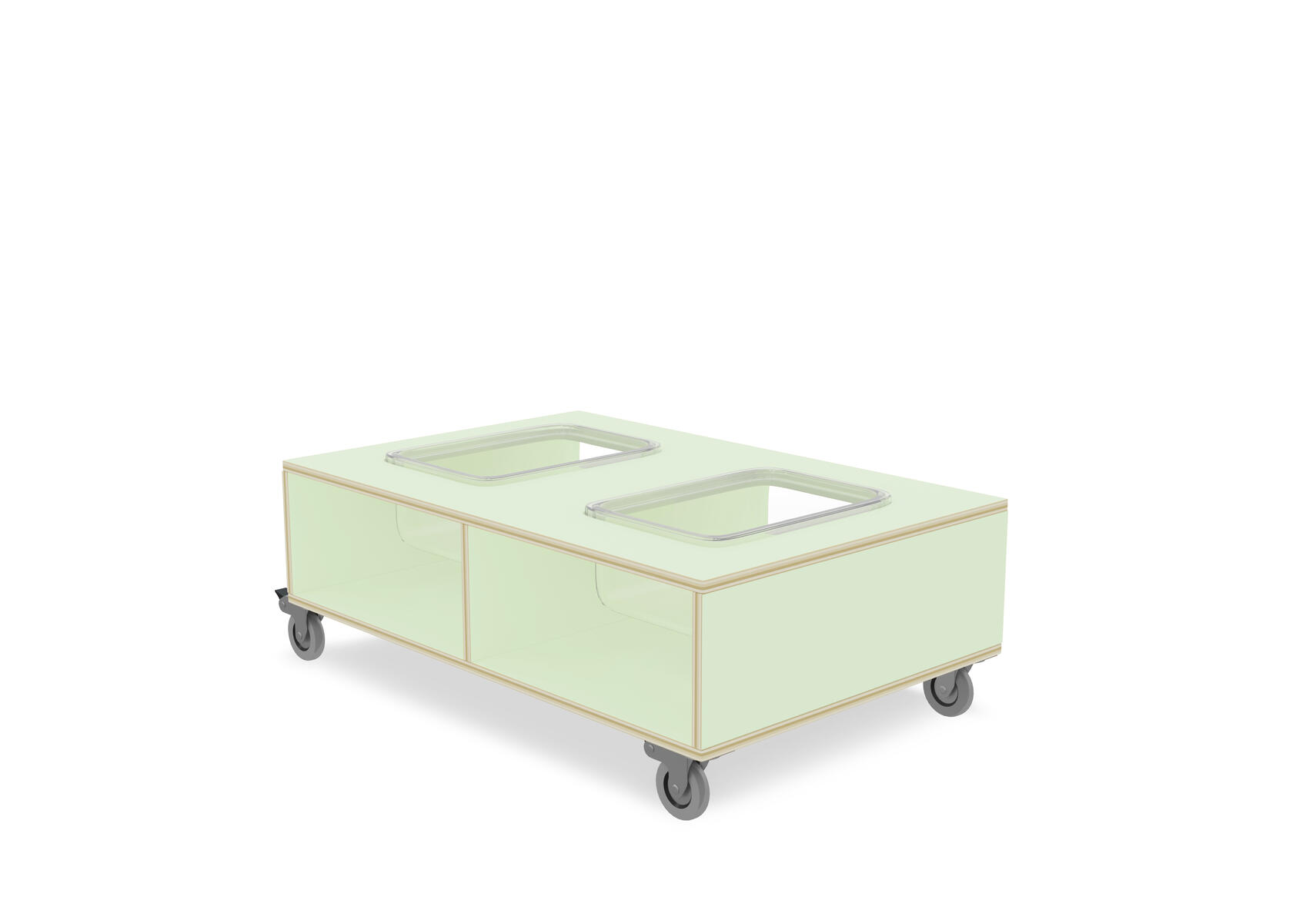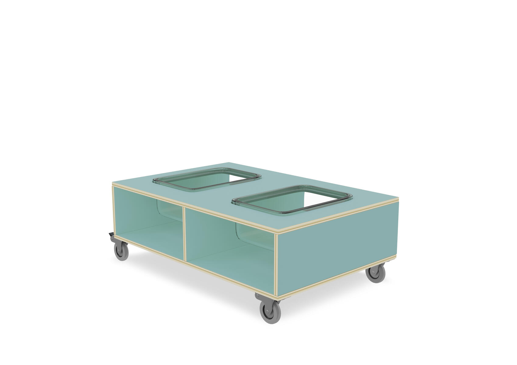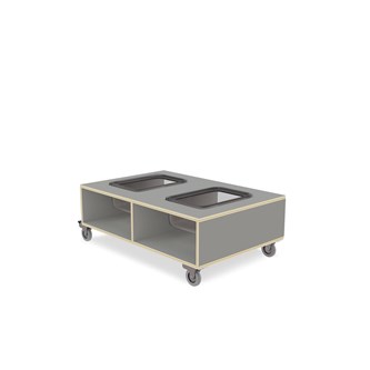 Färdig öppen modul, som levereras komplett med plastback och lock. Hjul med lås kräver montering. Borden finns i två höjder. De sensoriska lekborden är gjorda i 16 mm björkplywood. Färger med HT är med högtryckslaminat. Björk och vitpigmenterad är helt i 18 mm plywood. Plastback med lock mått B39xL29xD12,5 cm. Mått: B88xD58xH31 cm.