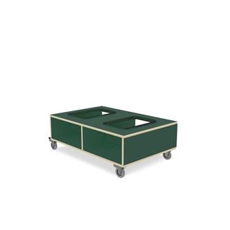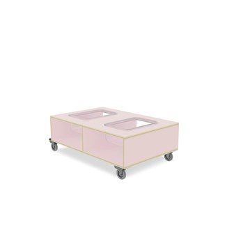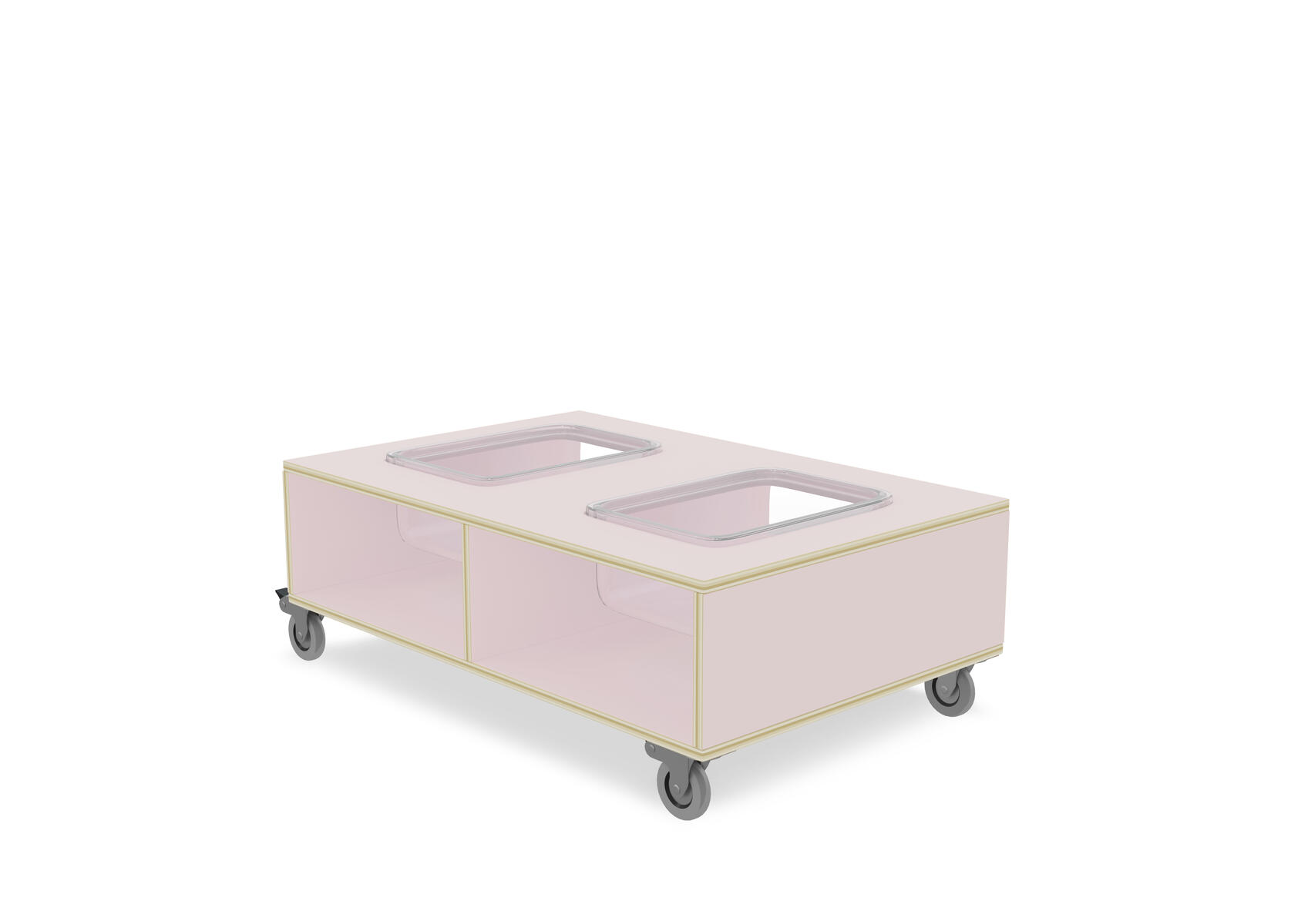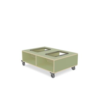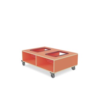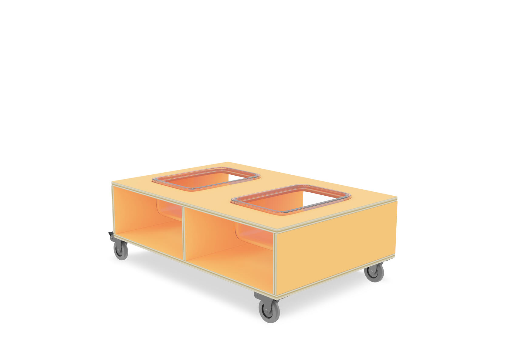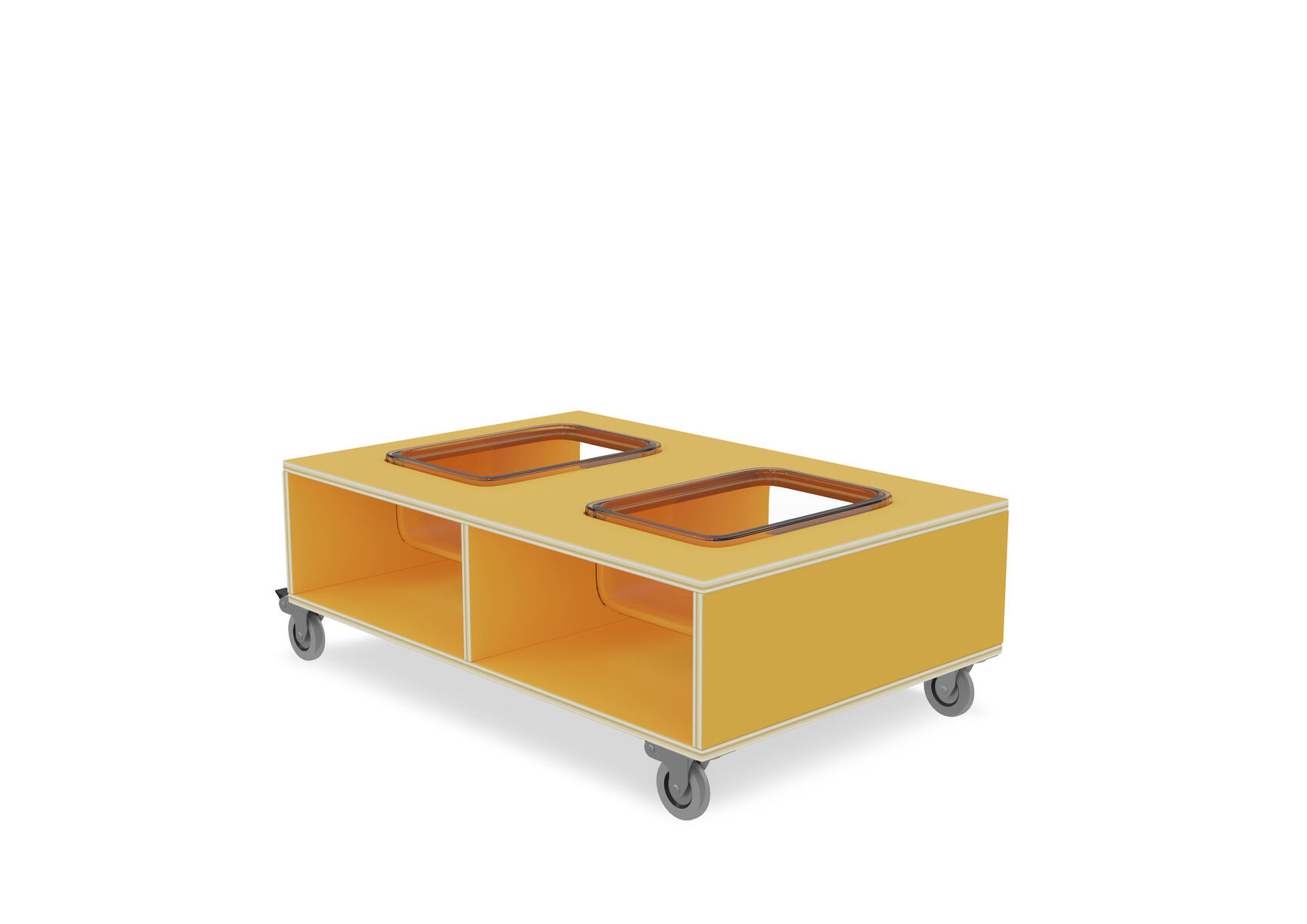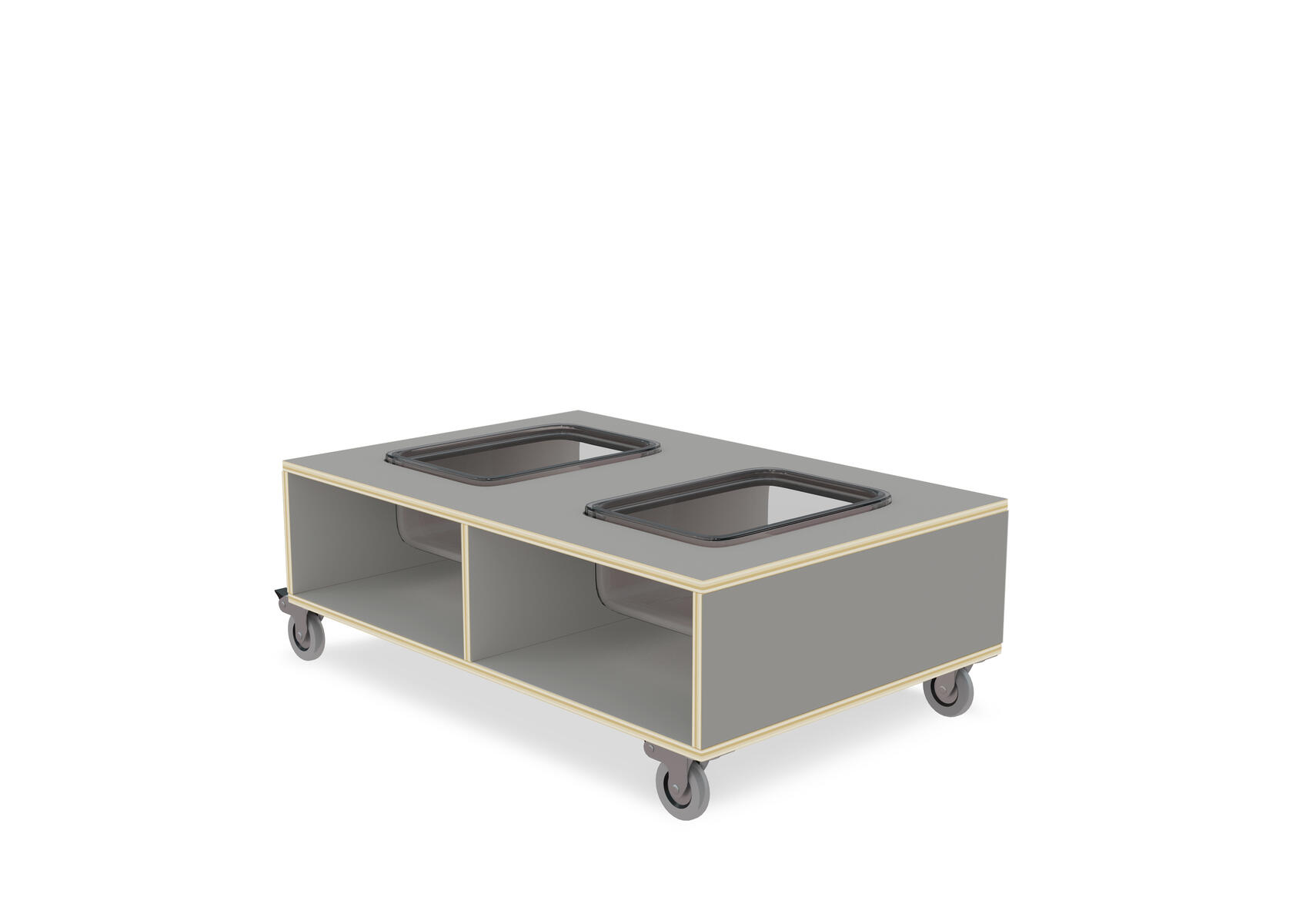 Färdig öppen modul, som levereras komplett med plastback och lock. Hjul med lås kräver montering. Borden finns i två höjder. De sensoriska lekborden är gjorda i 16 mm björkplywood. Färger med HT är med högtryckslaminat. Björk och vitpigmenterad är helt i 18 mm plywood. Plastback med lock mått B39xL29xD12,5 cm. Mått: B88xD58xH31 cm.