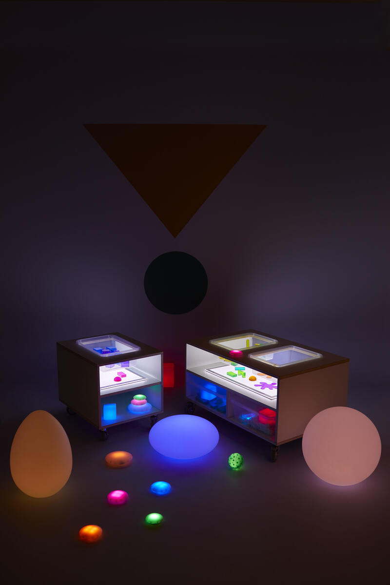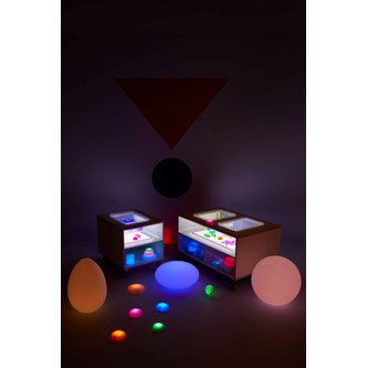 Ett set med 12 uppladdningsbara och självlysande, rundade stenar som kan staplas, rullas och sorteras. En bra resurs för sensorisk upplevelse och ett nytt sätt att uppmuntra barn att experimentera. Välj att visa ett spektrum av färger som ändras automatiskt, eller ställ in på en av de 7 olika fasta färgerna. Gör ett vanligt rum till ett sinnesrum och en kreativ lärmiljö på nolltid. Lyser i ca 10–12 timmar efter laddning. 3 olika storlekar, mått: ø 4,5–15 cm. Av ABS. PVC-fri. Från 1 år.