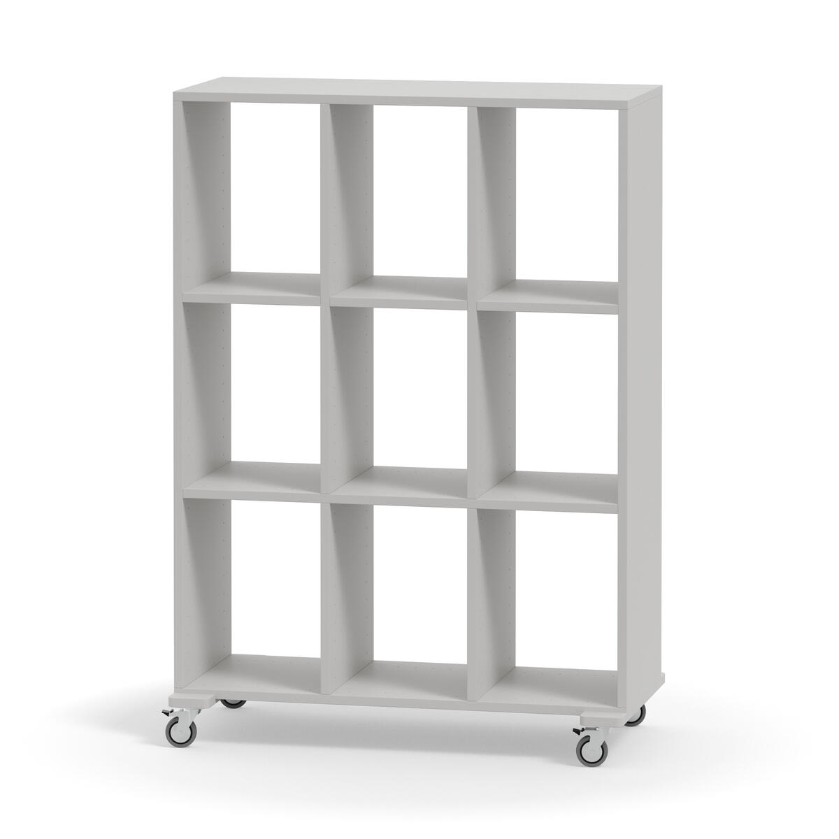 Färdigbyggd förvaring med 9 fack. Öppen förvaring utan rygg. Mellanväggar och hyllplan är fasta. Stödben med rörliga hjul med broms. Enkel montering av stödben. Svanenmärkt, licensnummer 5031 0099.