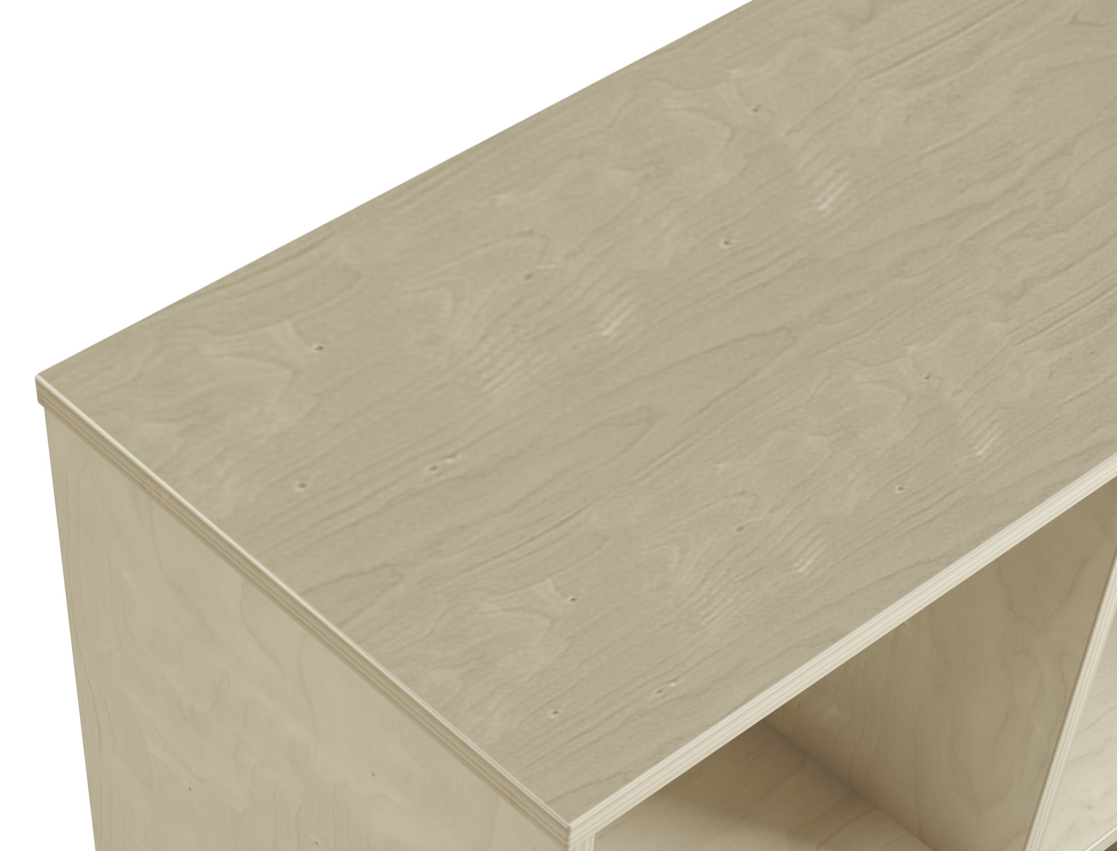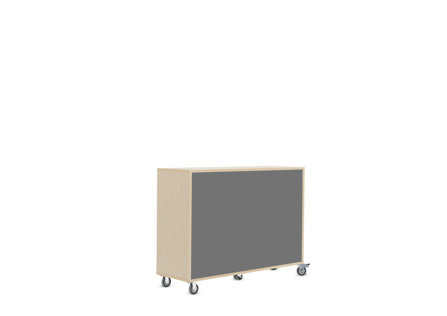 Förvaring med rygg i bulletin board. Tillverkas i björkkryssfaner av högsta kvalitet. 2 fasta hjul på ena kortsidan och 2 rörliga med låsbara hjul på den andra samt 1 i mitten. Förborrade hål för enkel montering av hjul. Mobila enheter ger en ökad flexibilitet och möjlighet att enkelt förändra rummets möblering. Undvik att placera tunga föremål högt upp i hyllan. Minska tipprisk genom att rikta hjulen framåt respektive bakåt samt lås hjulen. Val av färg är högtryckslaminat på förvaringens topp. Vid björkval är förvaringen helt i plywood.