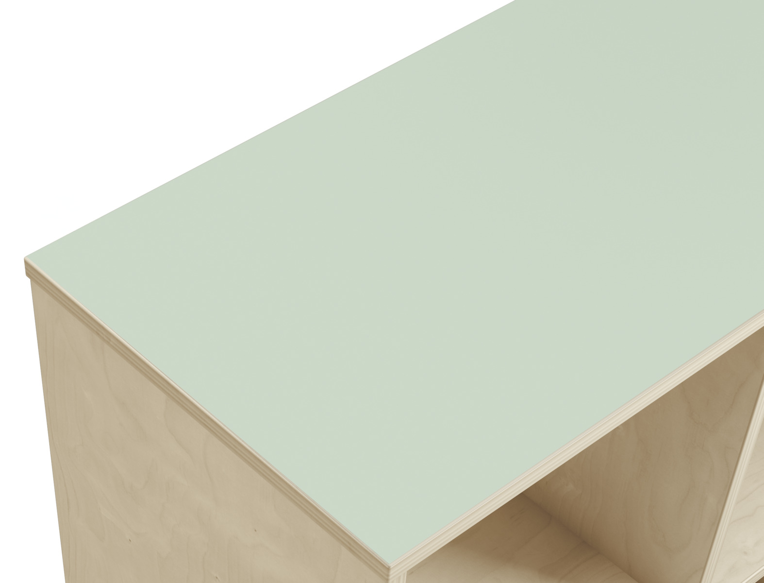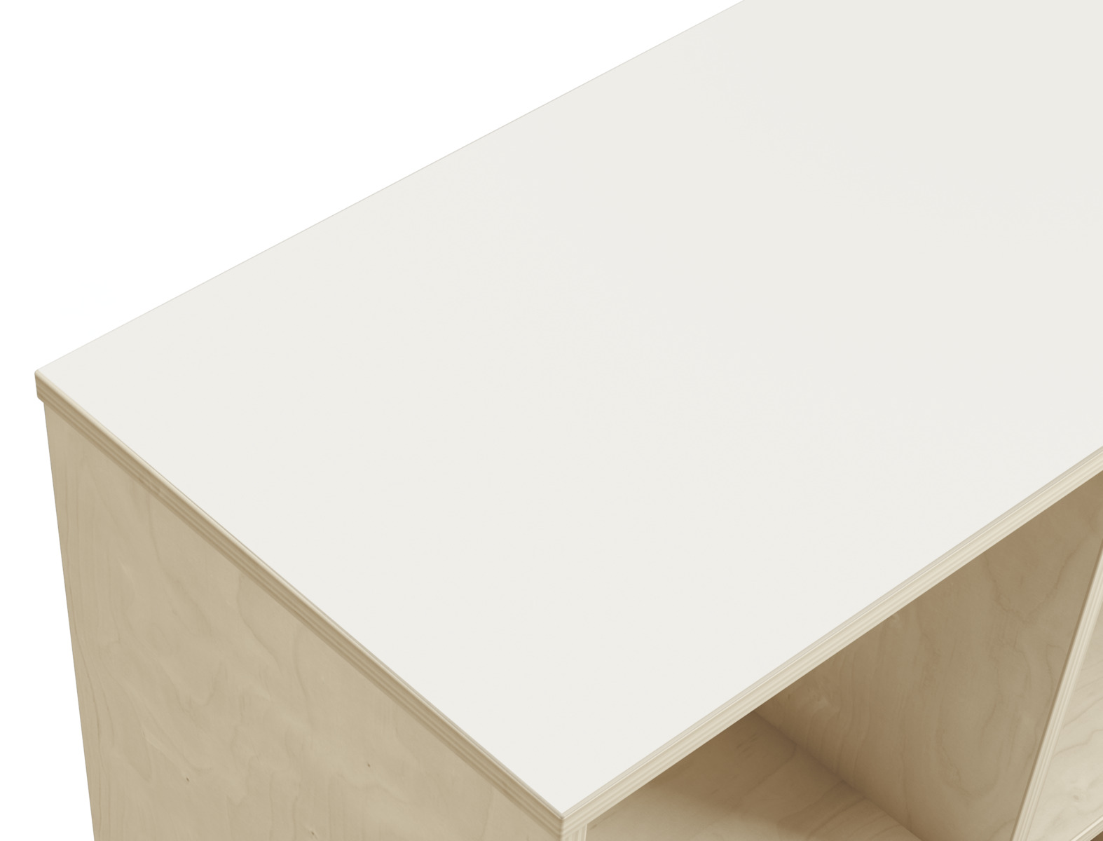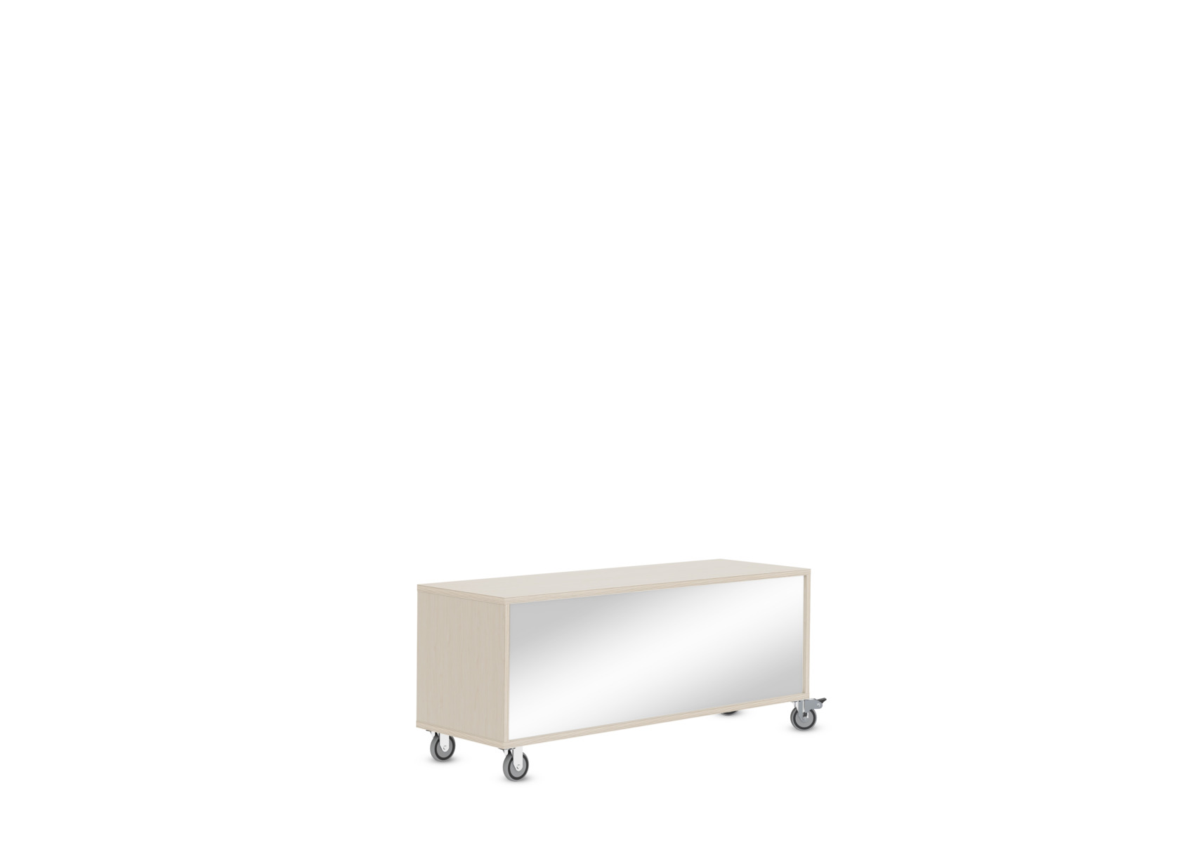 Förvaring med spegelrygg. Tillverkas i björkkryssfaner av högsta kvalitet. 2 fasta hjul på ena kortsidan och 2 rörliga med låsbara hjul på den andra. Förborrade hål för enkel montering av hjul. Mobila enheter ger en ökad flexibilitet och möjlighet att enkelt förändra rummets möblering. Undvik att placera tunga föremål högt upp i hyllan. Minska tipprisk genom att rikta hjulen framåt respektive bakåt samt lås hjulen. Val av färg är högtryckslaminat på förvaringens topp. Vid val av vitpigmenterad är förvaringen helt i plywood. Spegel av akrylplast.