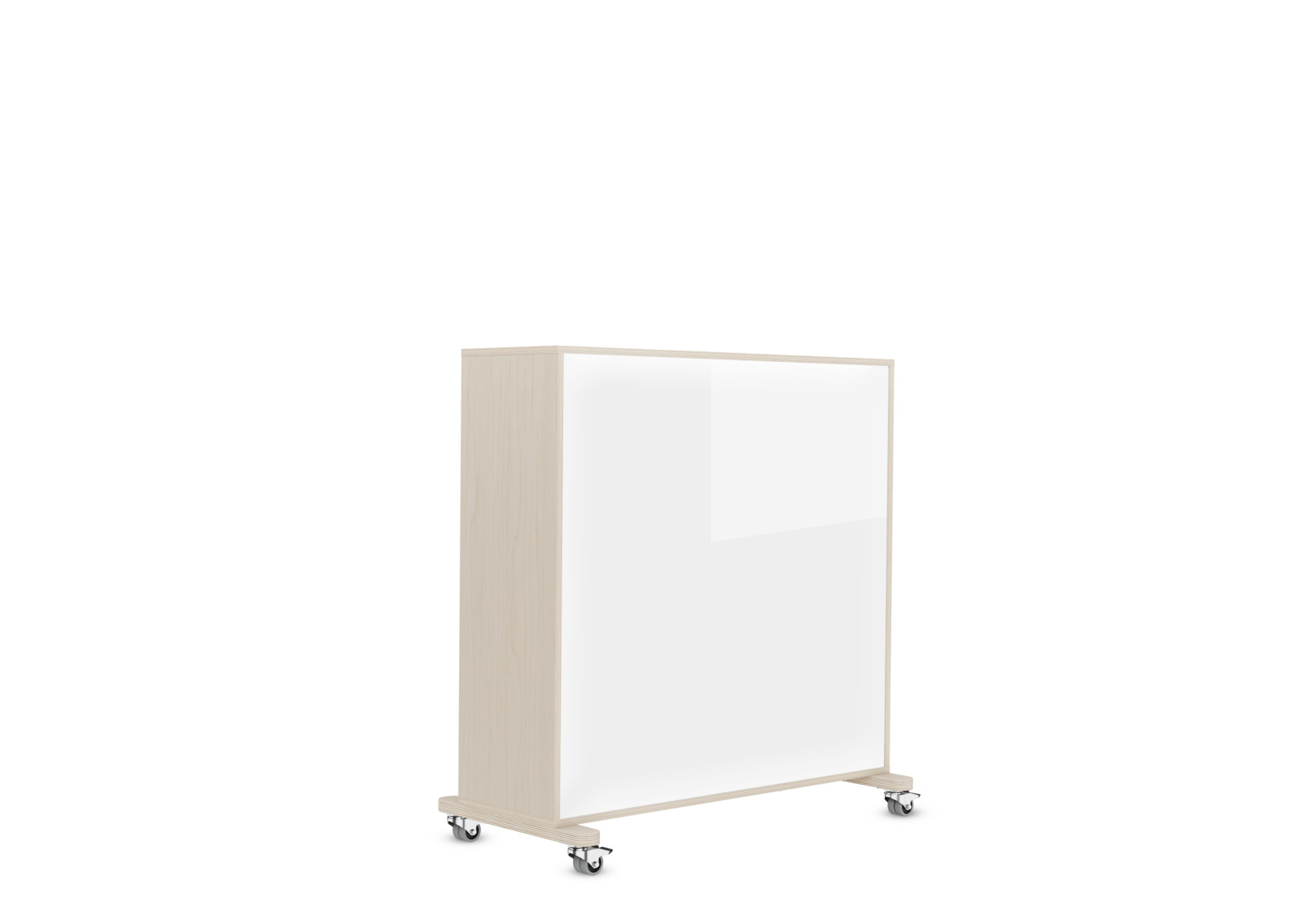 Förvaring med rygg i magnetisk whiteboard. Tillverkas i björkkryssfaner av högsta kvalitet. 2 fasta hjul på ena kortsidan och 2 rörliga med låsbara hjul på den andra. Förborrade hål för enkel montering av hjul. Mobila enheter ger en ökad flexibilitet och möjlighet att enkelt förändra rummets möblering. Undvik att placera tunga föremål högt upp i hyllan. Minska tipprisk genom att rikta hjulen framåt respektive bakåt samt lås hjulen. Val av färg är högtryckslaminat på förvaringens topp. Vid björkval är förvaringen helt i plywood.