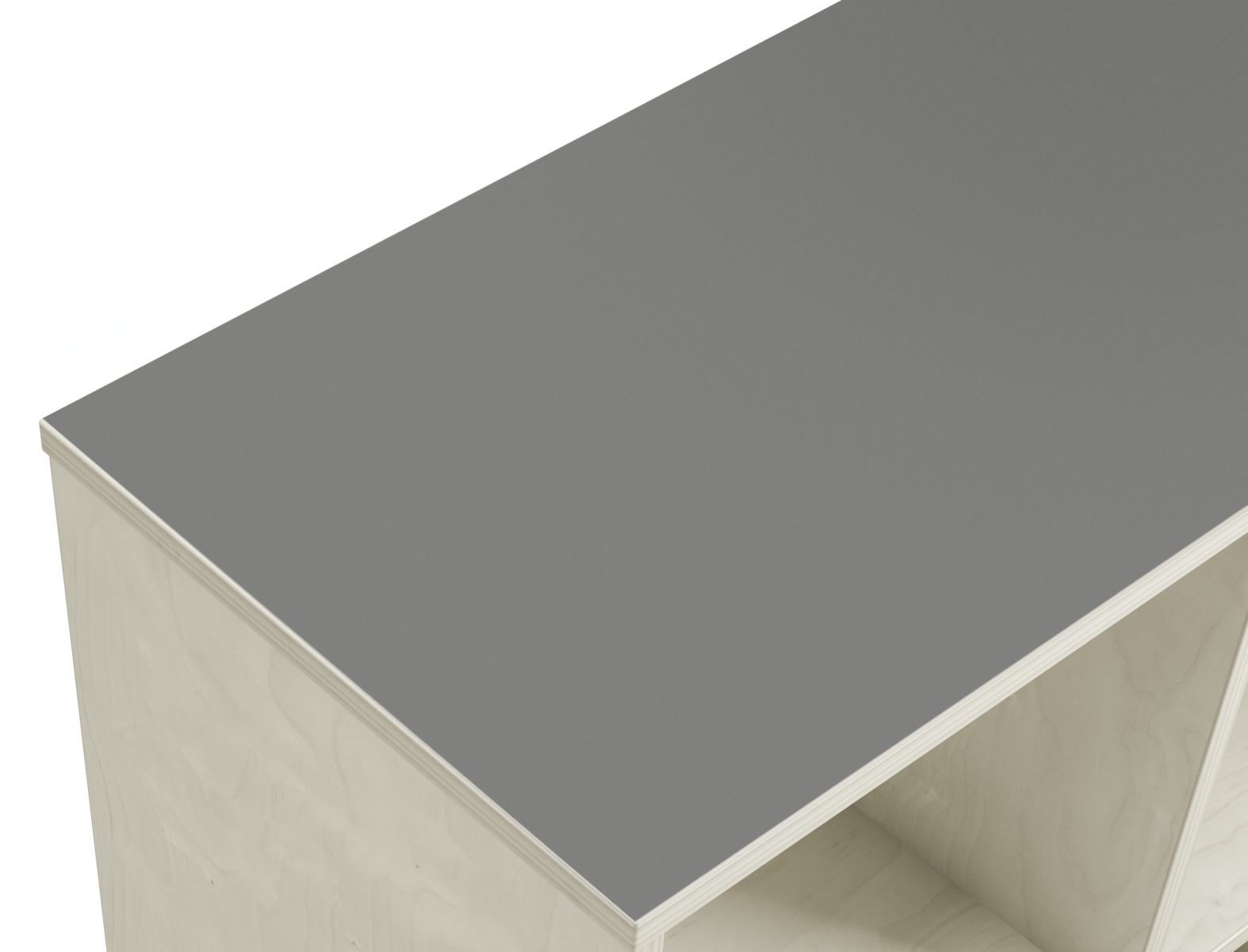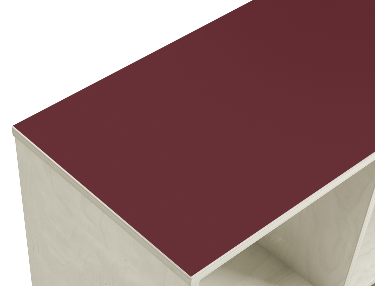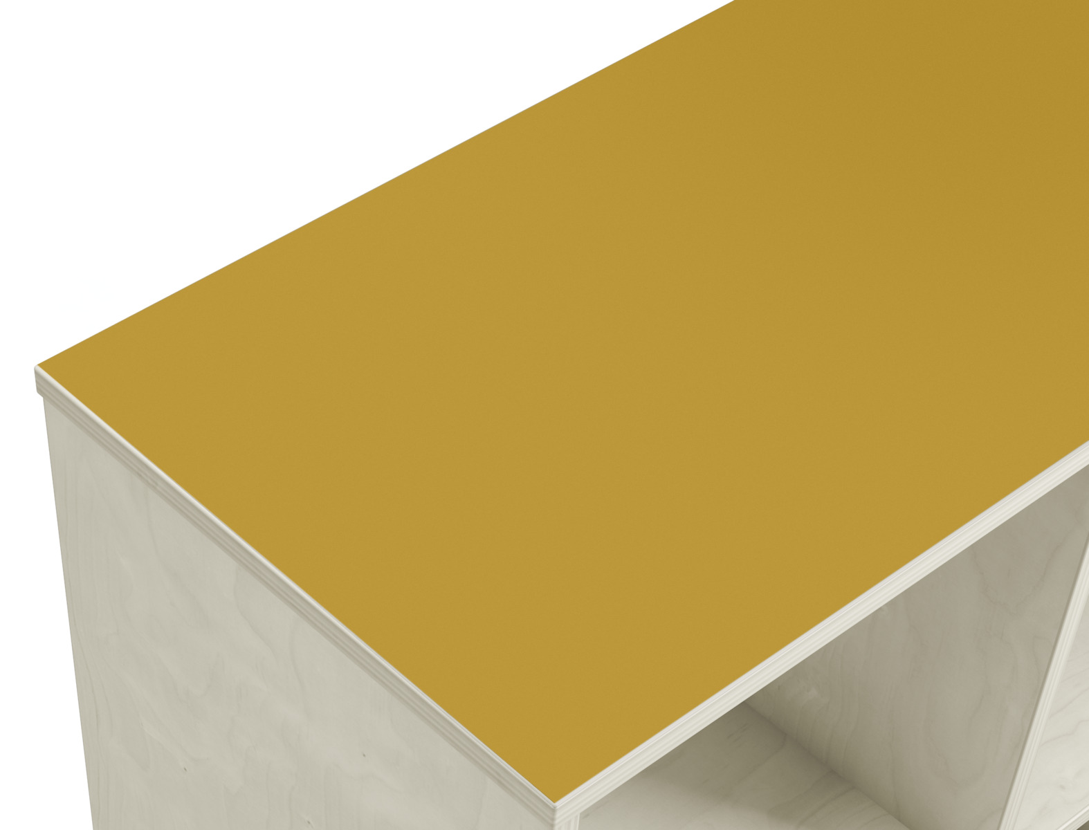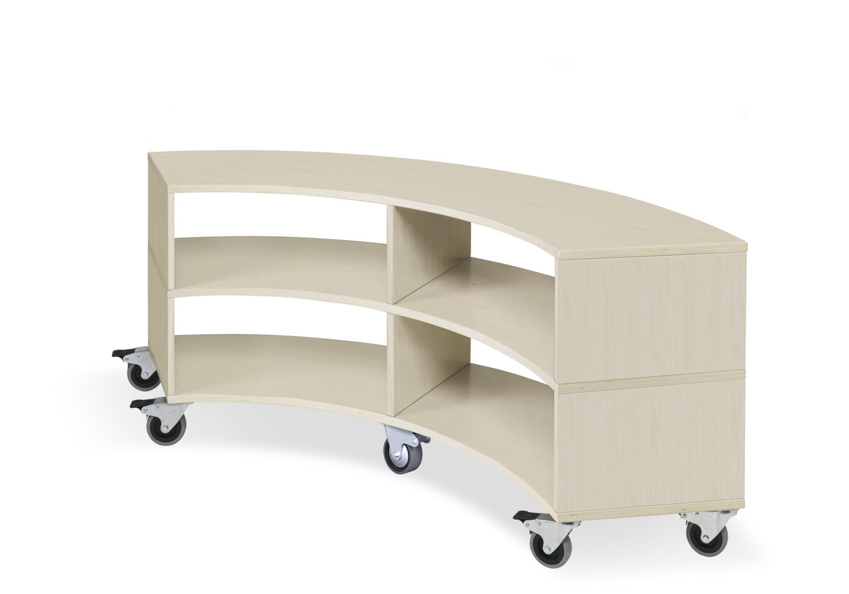 Svängd förvaringshylla i björkkryssfaner av högsta kvalitet. Ytterradie 106 cm och innerradie 68,5 cm. Välj färg av högtryckslaminat på toppen. Val av kryssfaner/vitpigmenterad är hela förvaringen i plywood. 5 roterbara, låsbara hjul.