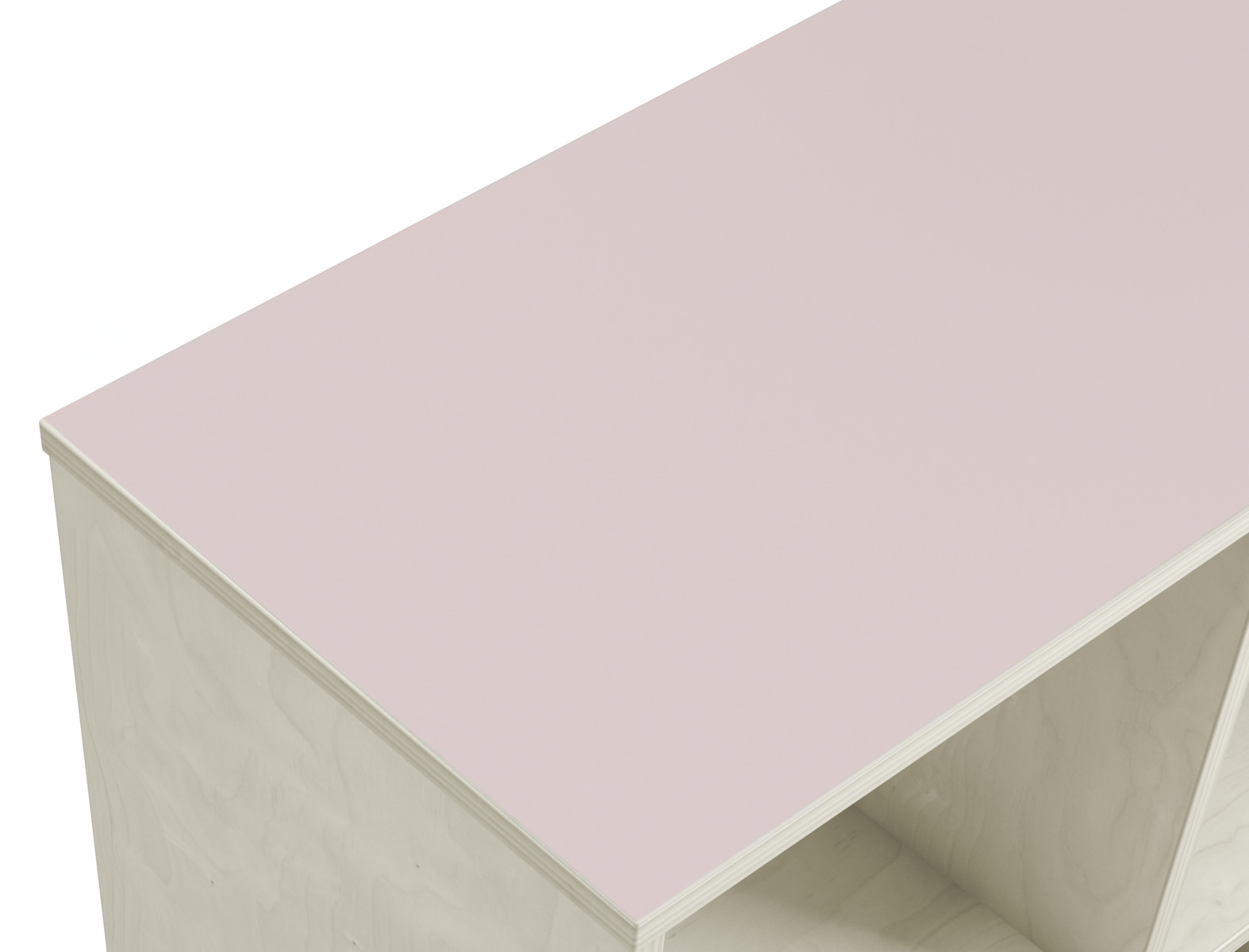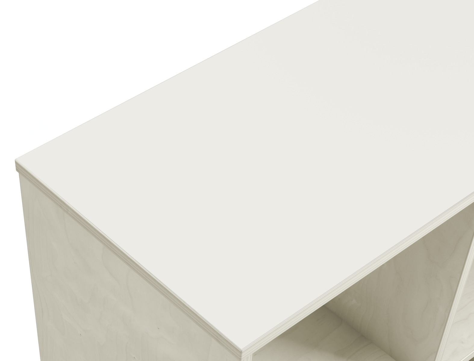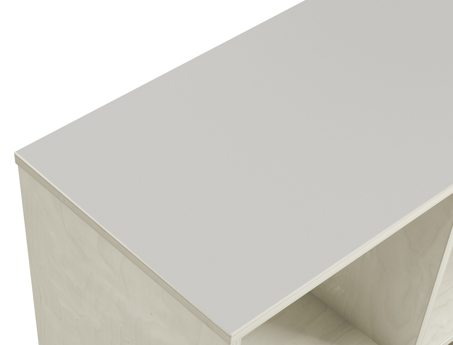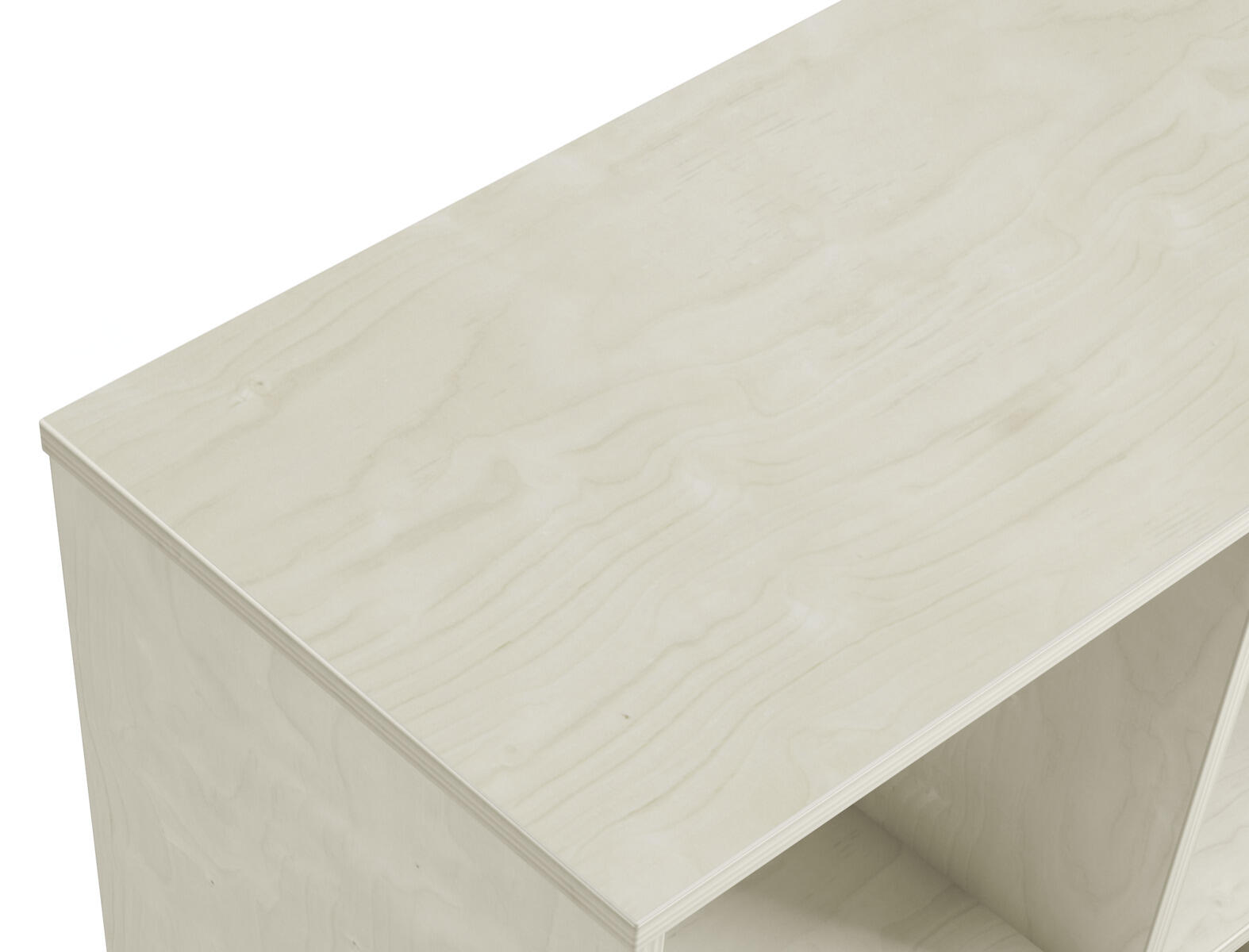 Svängd förvaringshylla i björkkryssfaner av högsta kvalitet. Ytterradie 106 cm och innerradie 68,5 cm. Välj färg av högtryckslaminat på toppen. Val av kryssfaner/vitpigmenterad är hela förvaringen i plywood. 5 roterbara, låsbara hjul.