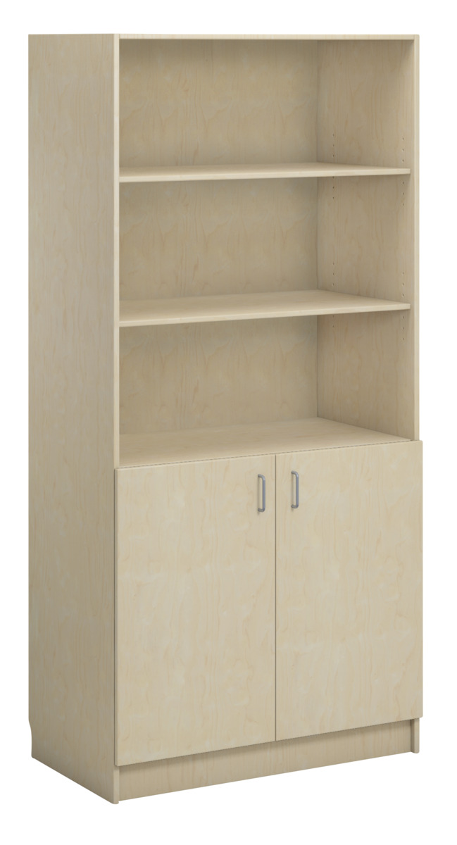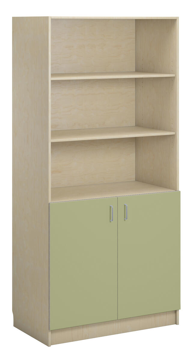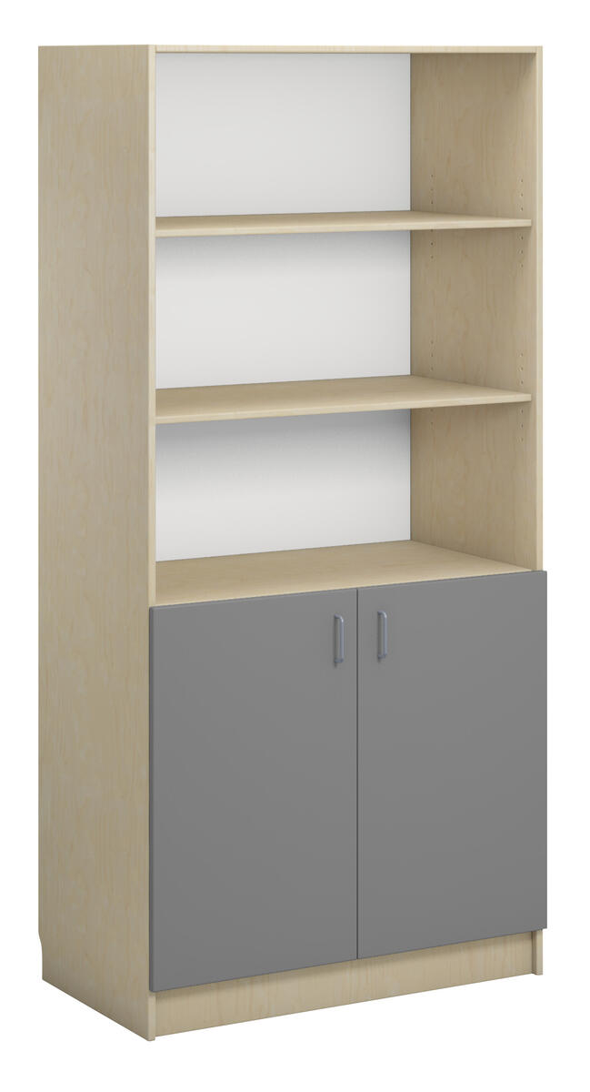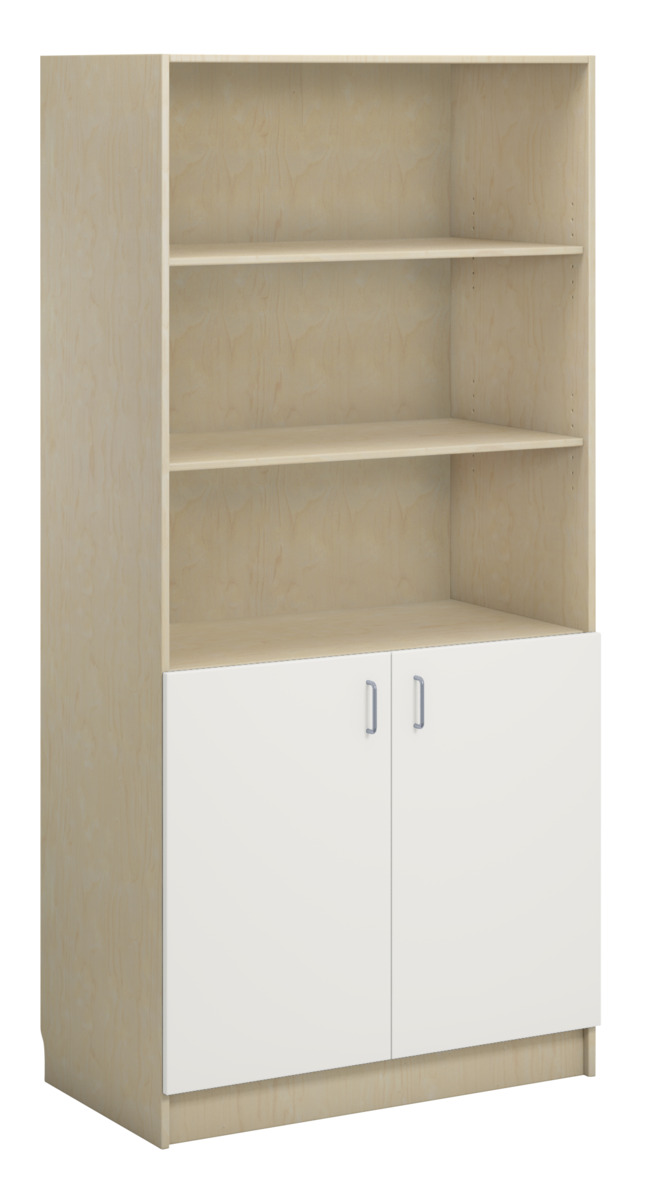 Bokhylla på sockel i direktlaminat. 2 låga hela dörrar på nedre delen av hyllan vilka täcker 2 hyllplan. Stommen kan fås i 3 olika utföranden och fronterna kan fås. Inredd med 5 hyllplan varav 3 är flyttbara.
