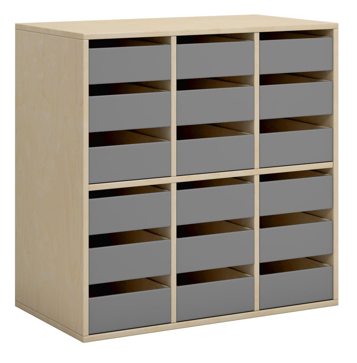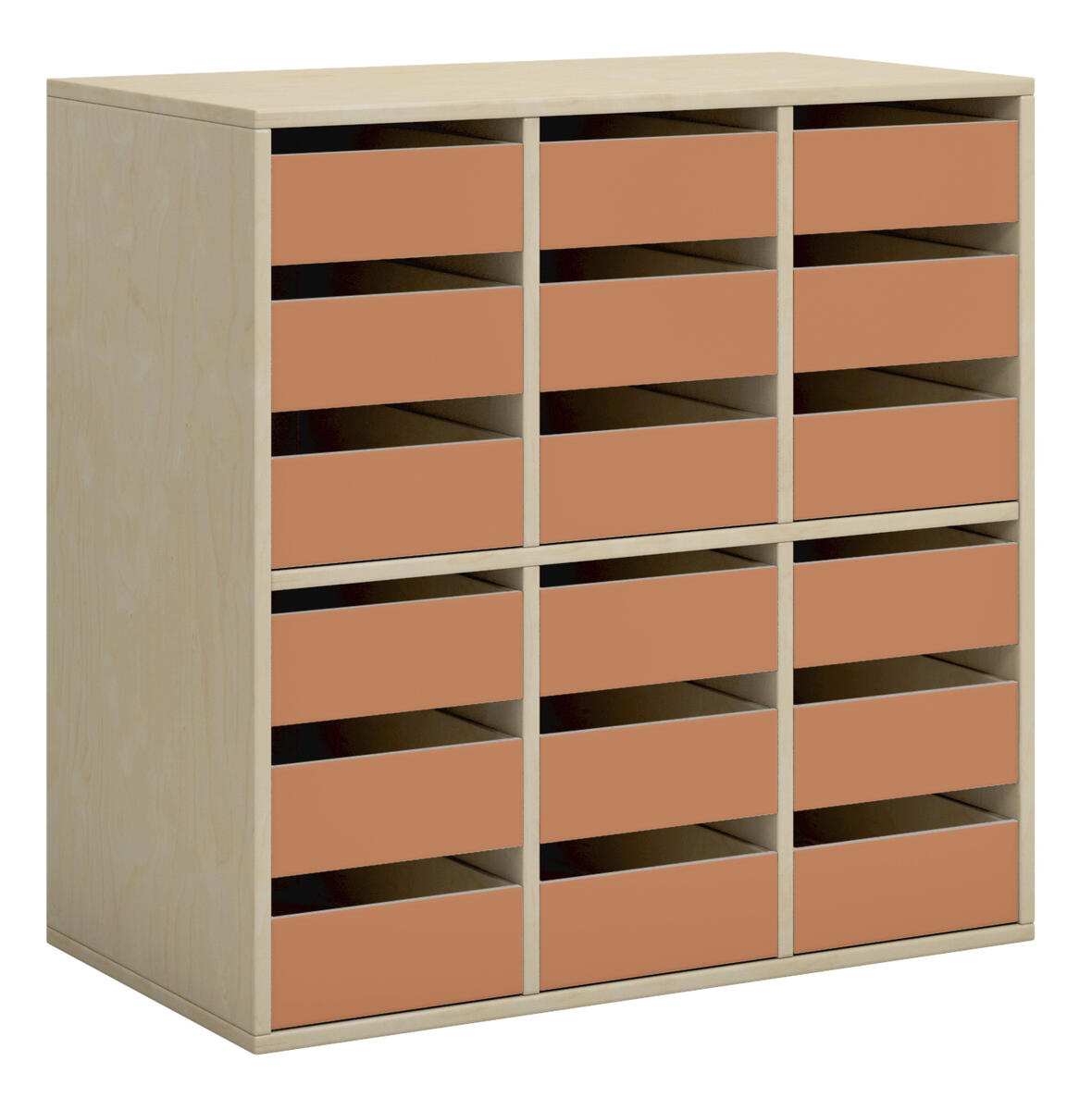 Elevskåp i direktlaminat. Fronter i antingen direktlaminat eller högtryckslaminat. Inredd med 6 lådor och 6 fack. Kompletteras med sockel eller hjulplatta. Lådornas innermått: B34xD34xH4 cm.