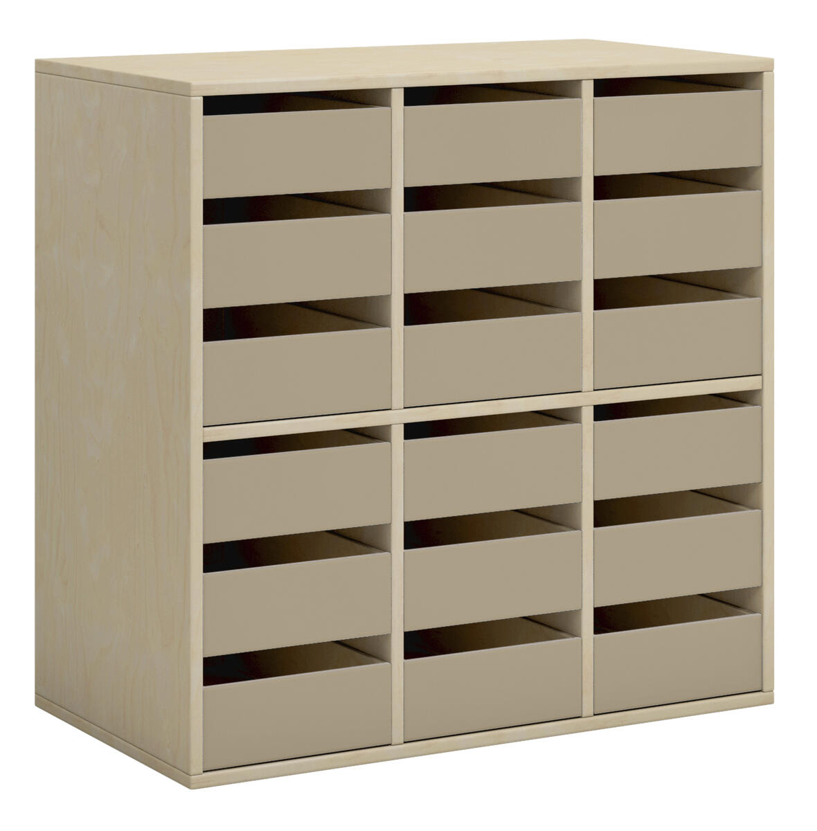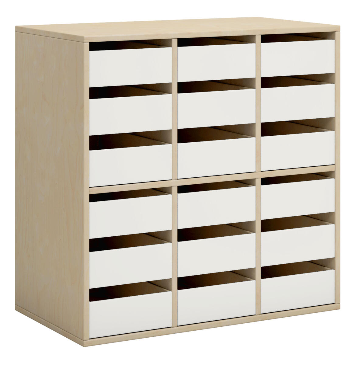 Elevskåp i direktlaminat. Fronter i antingen direktlaminat eller högtryckslaminat. Inredd med 18 små lådor. Kompletteras med sockel eller hjulplatta. Lådornas innermått: B21xD34xH4 cm.