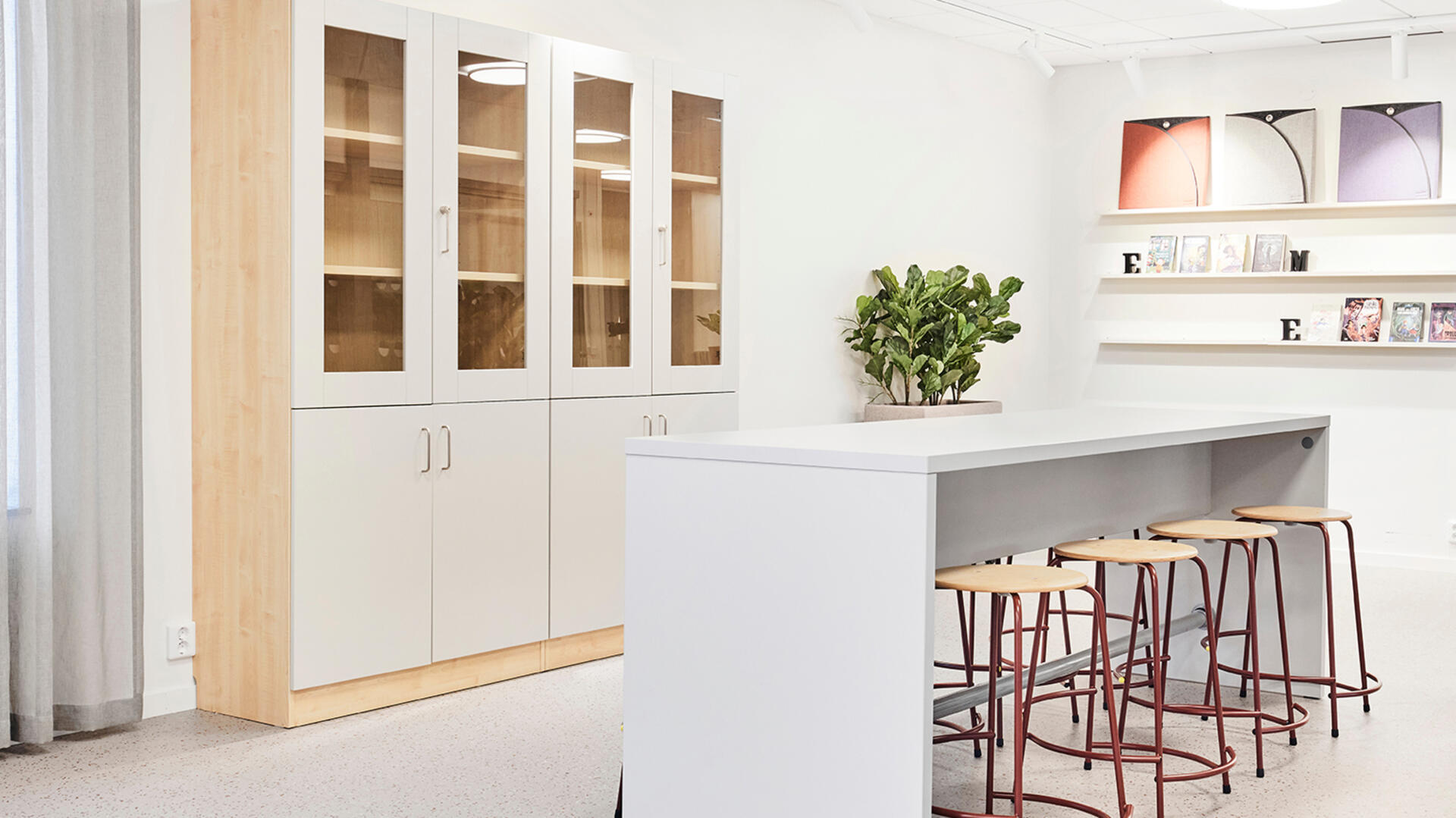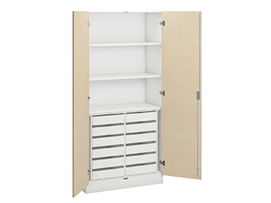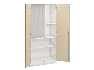 Håll ordning på material med Norden materialskåp. De har en robust stomme i laminat och kan anpassas med fronter i laminat eller högtryckslaminat. Välj mellan hyllplan, fack eller specifik inredning för sybehör, musikinstrument, verktyg och sportutrustning. Vi erbjuder även skåp för madrasser och sänglinne, vilket gör att Norden-serien kan tillmötesgå många olika behov i skolan eller förskolan och bidra till en enhetlig och trivsam inredning.